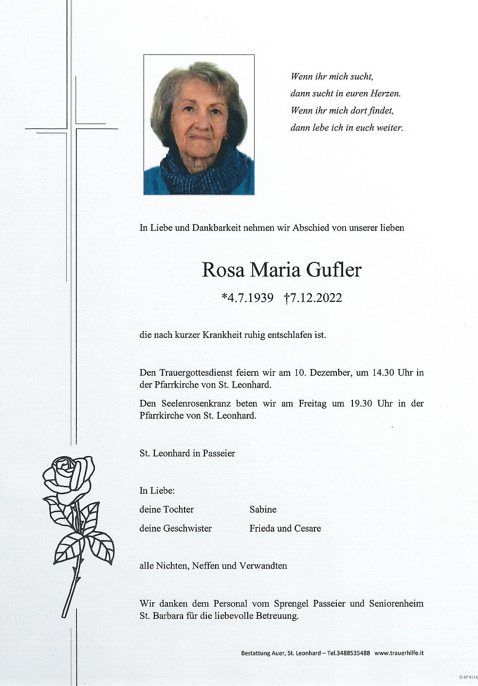 Den Trauergottesdienst feiern wir am Samstag, 10. Dezember, um 14.30 Uhr in der Pfarrkirche von St. Leonhard.