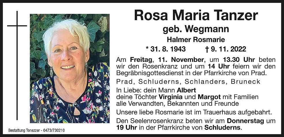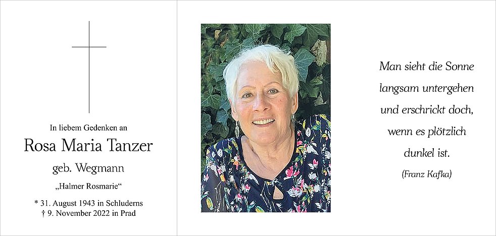 Am Freitag, 11. November, um 13.30 Uhr beten wir den Rosenkranz und um 14 Uhr feiern wir den Begräbnisgottesdienst in der Pfarrkirche von Prad.