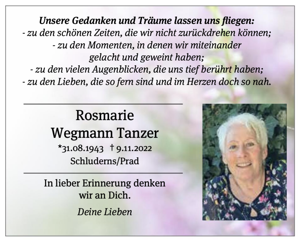 Unsere liebe Rosmarie ist im Trauerhaus (Sackgasse 16, Prad) aufgebahrt.