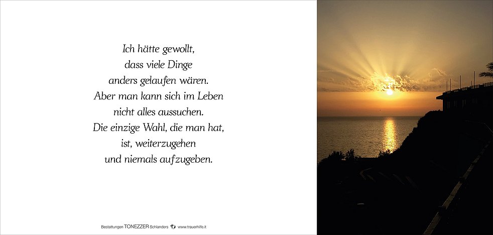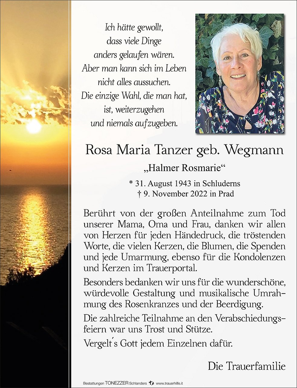 Wir bedanken uns herzlich bei Hedwig, Samantha, Luise, Gena, Anja, Edeltraud, den Montags- und Donnerstagskartern, dem Team vom Haus- und Hauskrankenpflegedienst Sprengel Obervinschgau, den Ärzten Frau Dr. Bettina Skocir, Dr. Giuseppe Camiletti, dem Palliativteam vom Krankenhaus Meran um Dr. Paolo Bellingeri und allen anderen, die uns in dieser Zeit beigestanden sind.