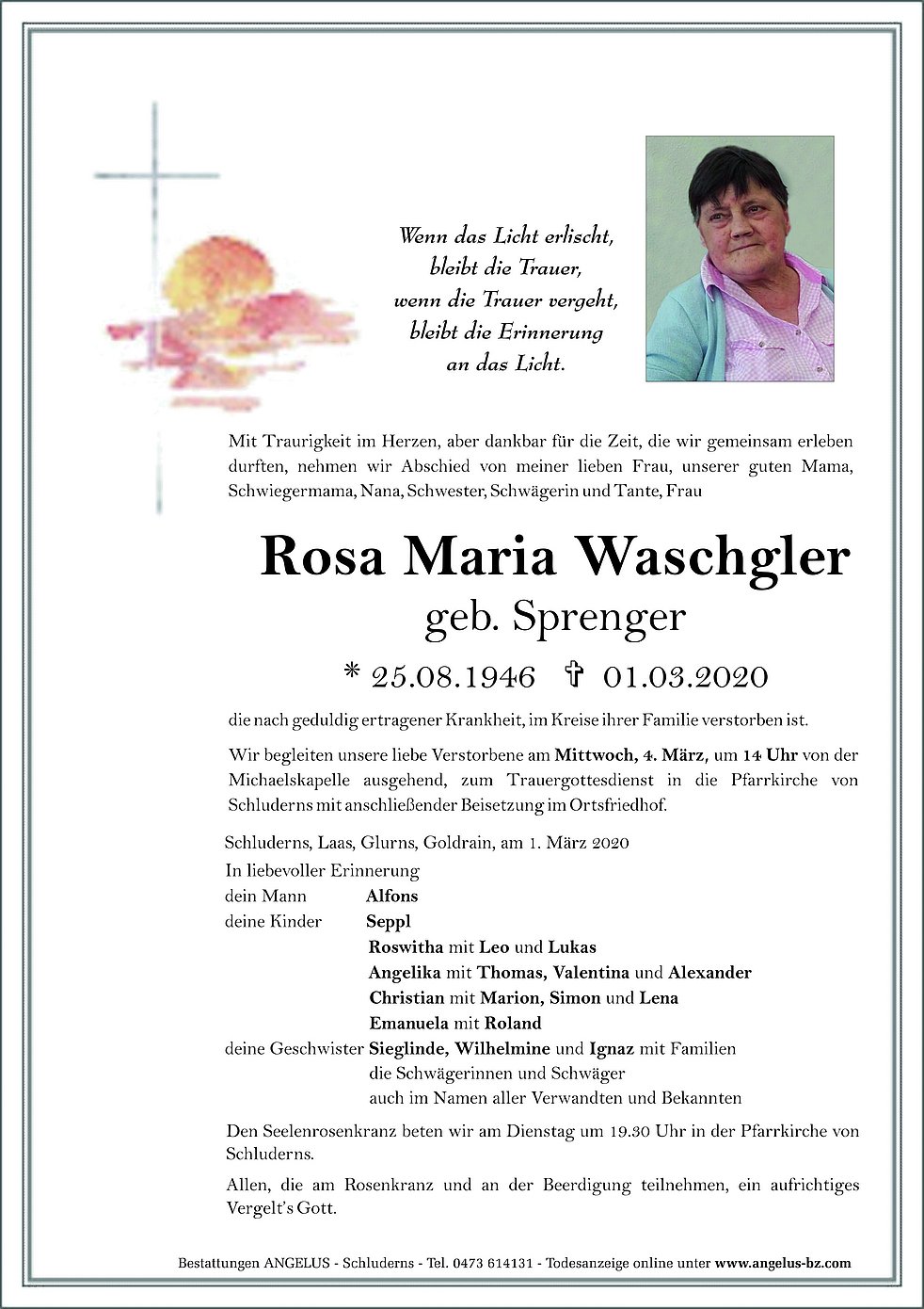Bestattungen ANGELUS - Schluderns - Tel. 0473 614131 - Todesanzeige online unter www.angelus-bz.com
