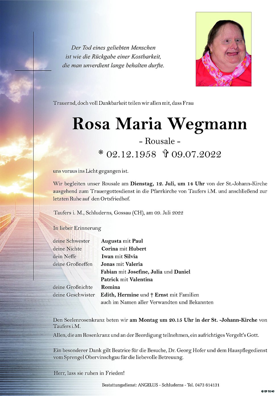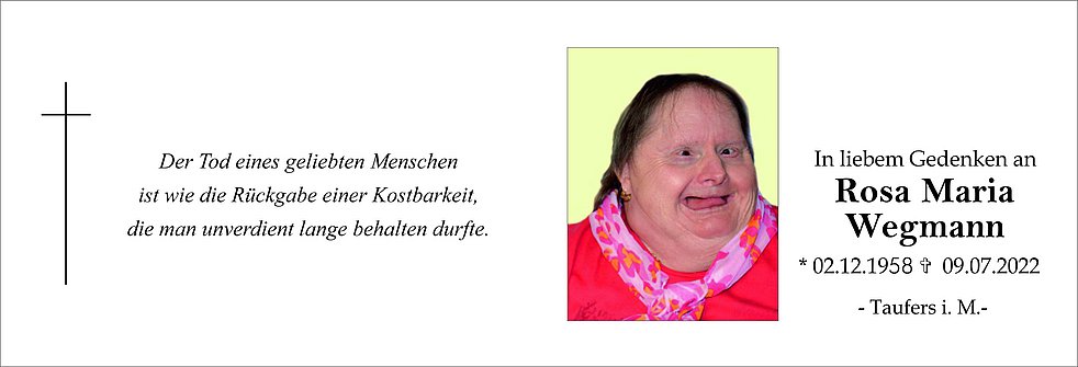 Wir begleiten unser Rousale am Dienstag, 12. Juli, um 14 Uhr von der St.-Johann-Kirche ausgehend zum Trauergottesdienst in die Pfarrkirche von Taufers i. M. und anschließend zur letzten Ruhe auf den Ortsfriedhof.