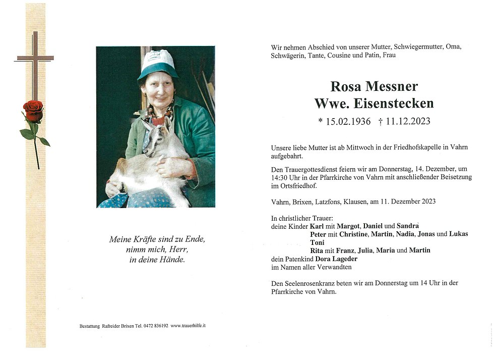 Begräbnisgottesdienst: 14.12. - 14:30 Uhr Pfarrkirche und Friedhof Vahrn