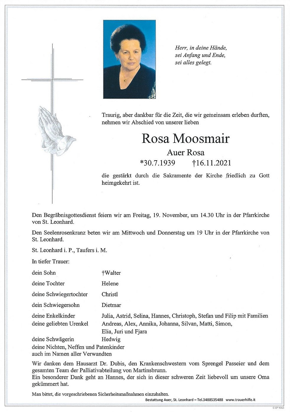 Den Begräbnisgottesdienst feiern wir am Freitag, 19. November, um 14.30 Uhr in der Pfarrkirche von St. Leonhard.