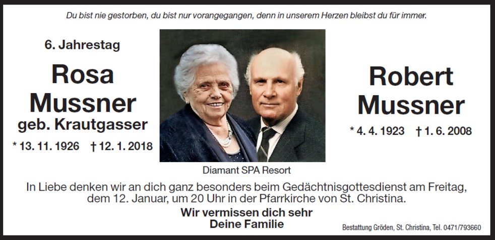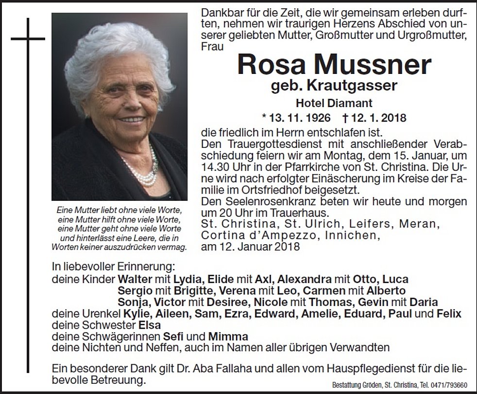 Den Trauergottesdienst mit anschließender Verabschiedung feiern wir am Montag, dem 15. Januar, um 14.30 Uhr in der Pfarrkirche von St. Christina. Die Urne wird nach erfolgter Einäscherung im Kreise der Familie im Ortsfriedhof beigesetzt.