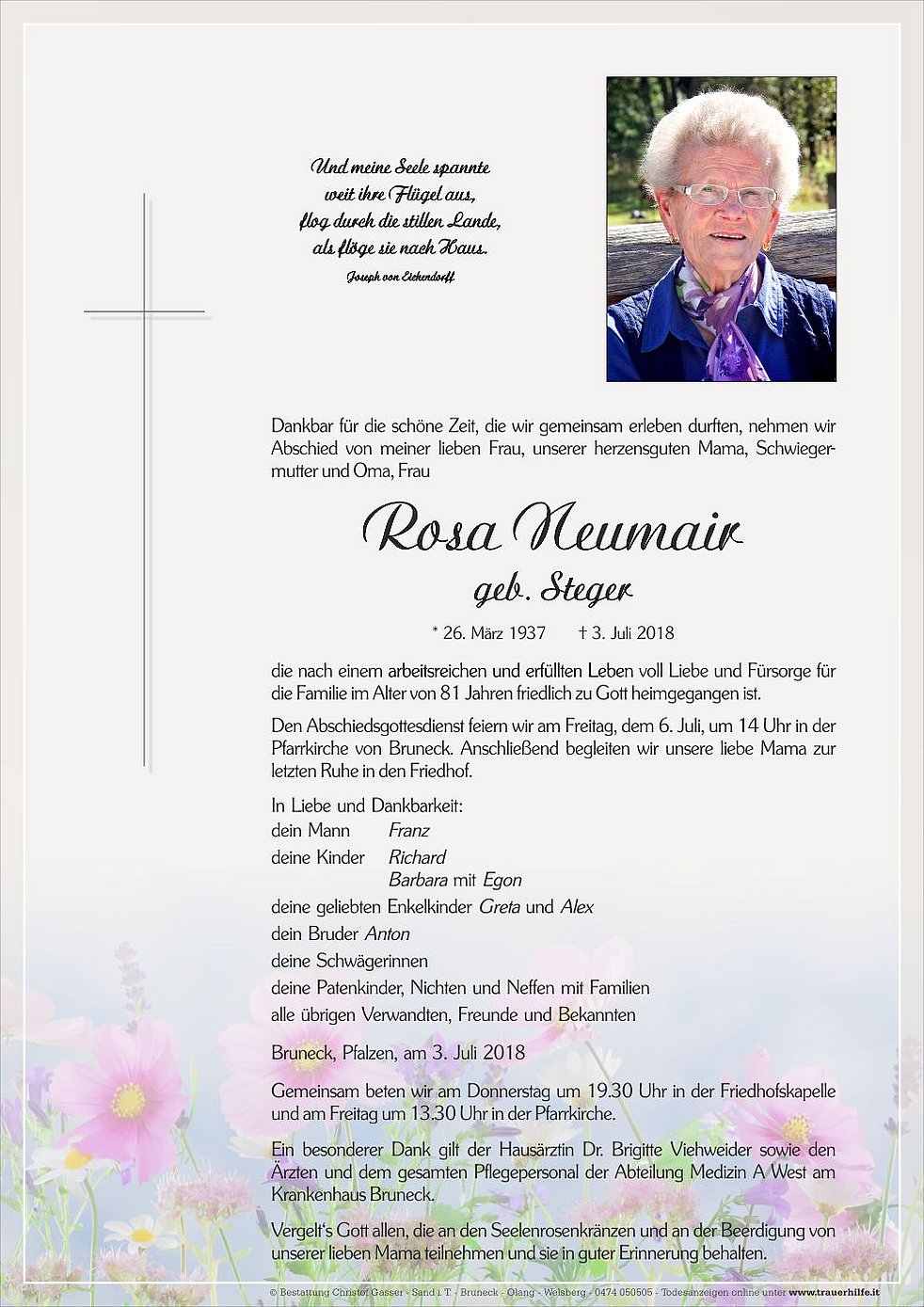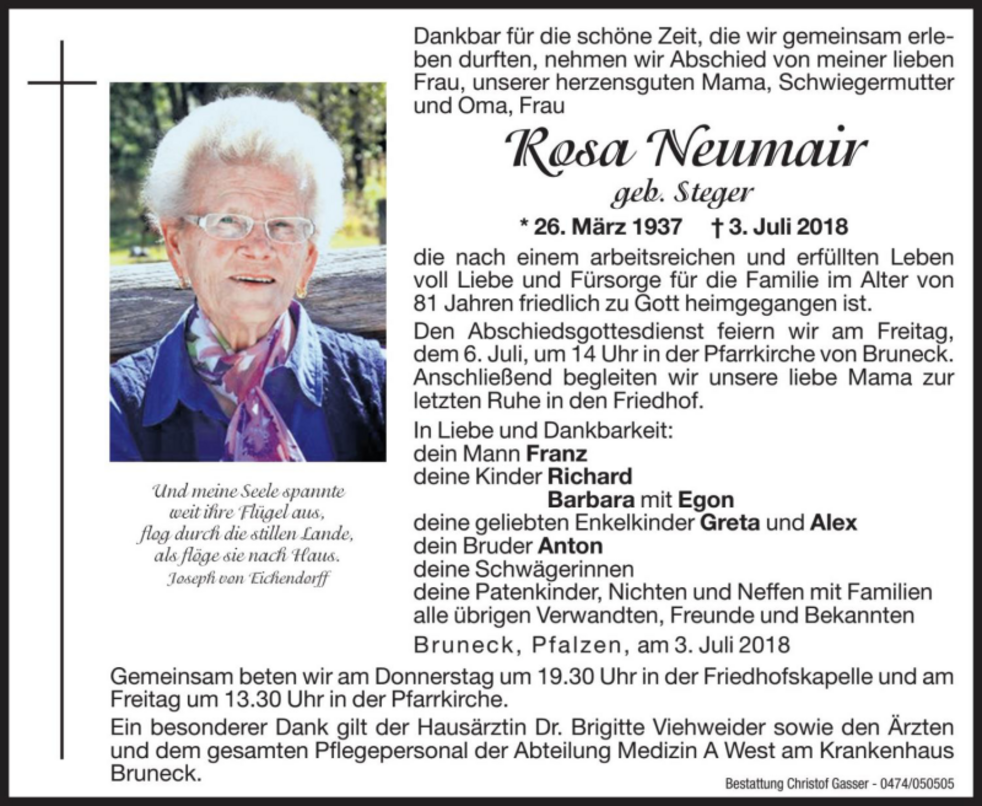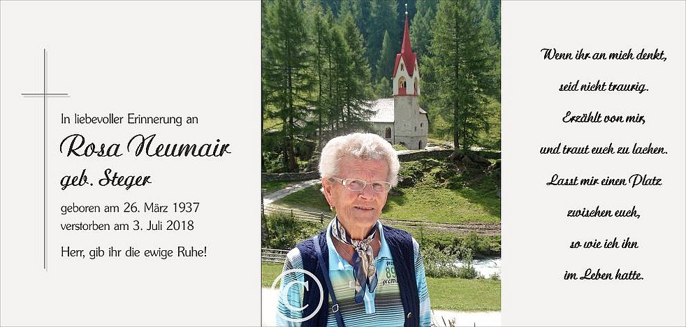 Den Abschiedsgottesdienst feiern wir am Freitag, dem 6. Juli, um 14 Uhr in der Pfarrkirche von Bruneck. Anschließend begleiten wir unsere liebe Mama zur letzten Ruhe in den Friedhof.
