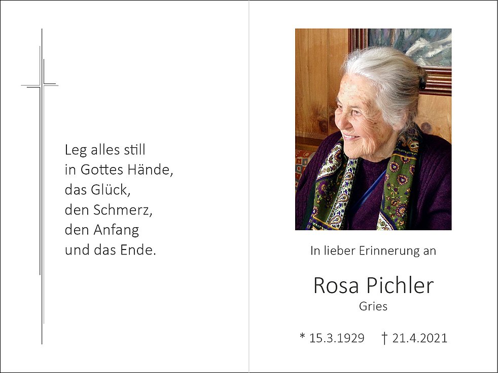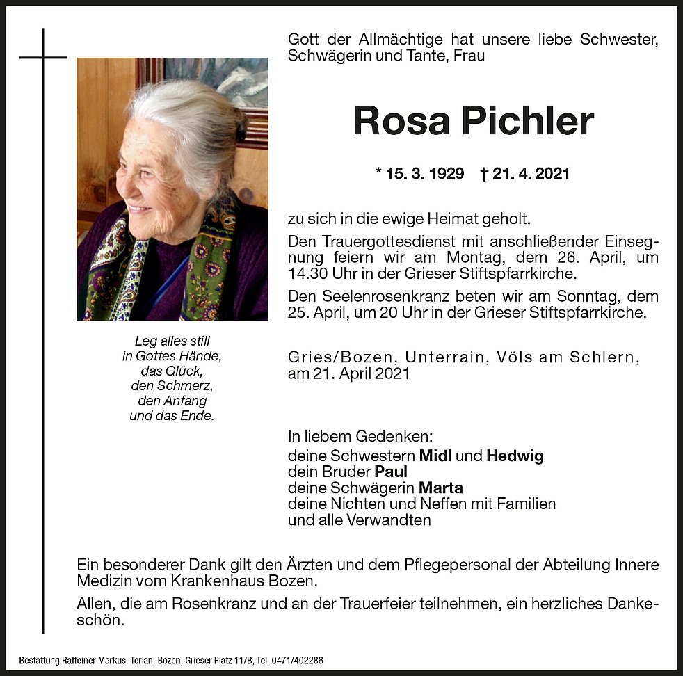 Den Trauergottesdienst mit anschließender Einsegnung feiern wir am Montag, dem 26. April, um 14.30 Uhr in der Grieser Stiftspfarrkirche.
