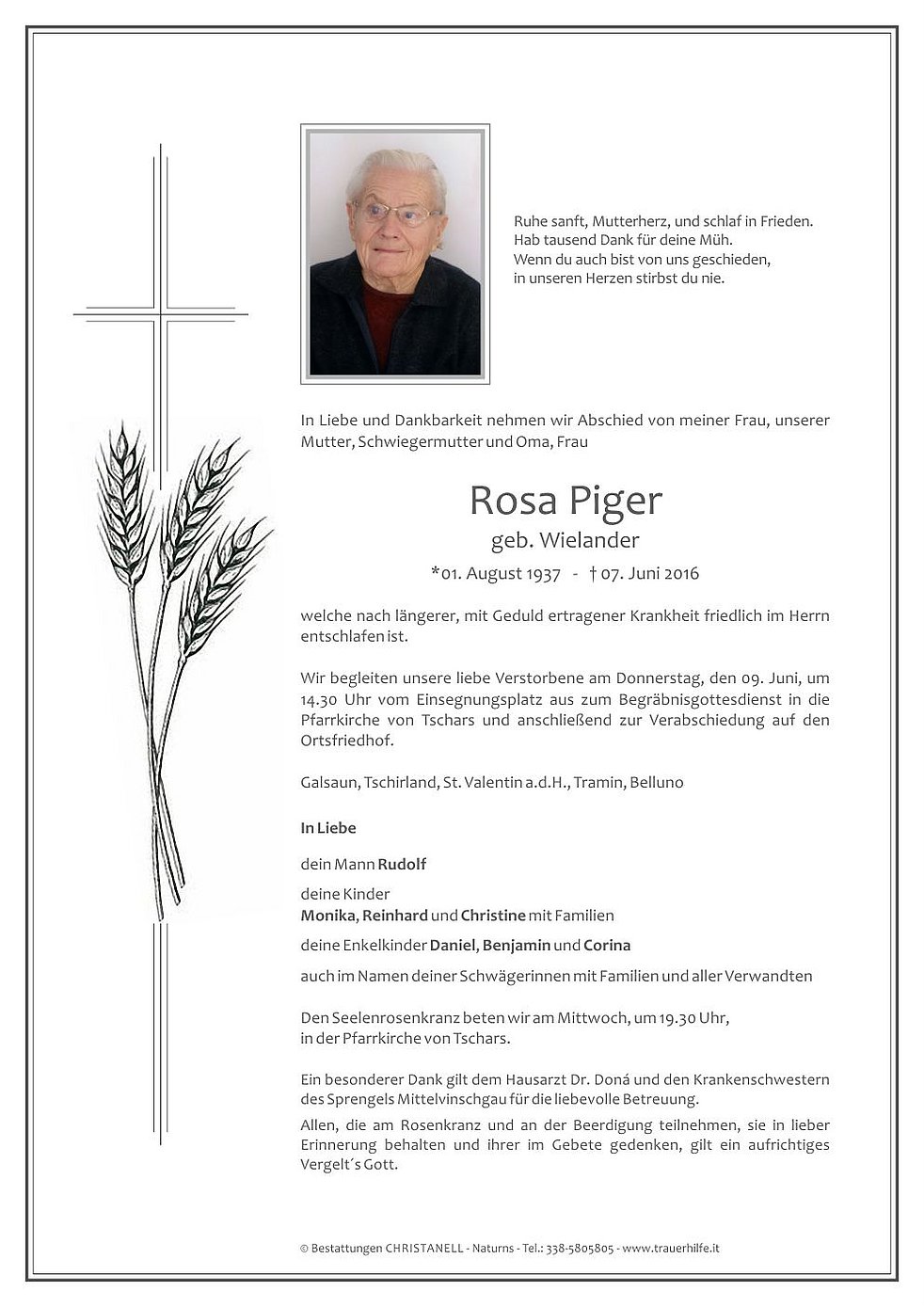 Wir begleiten unsere liebe Verstorbene am Donnerstag, den 09. Juni, um 14.30 Uhr vom Einsegnungsplatz aus zum Begräbnisgottesdienst in die Pfarrkirche von Tschars und anschließend zur Verabschiedung auf den Ortsfriedhof.