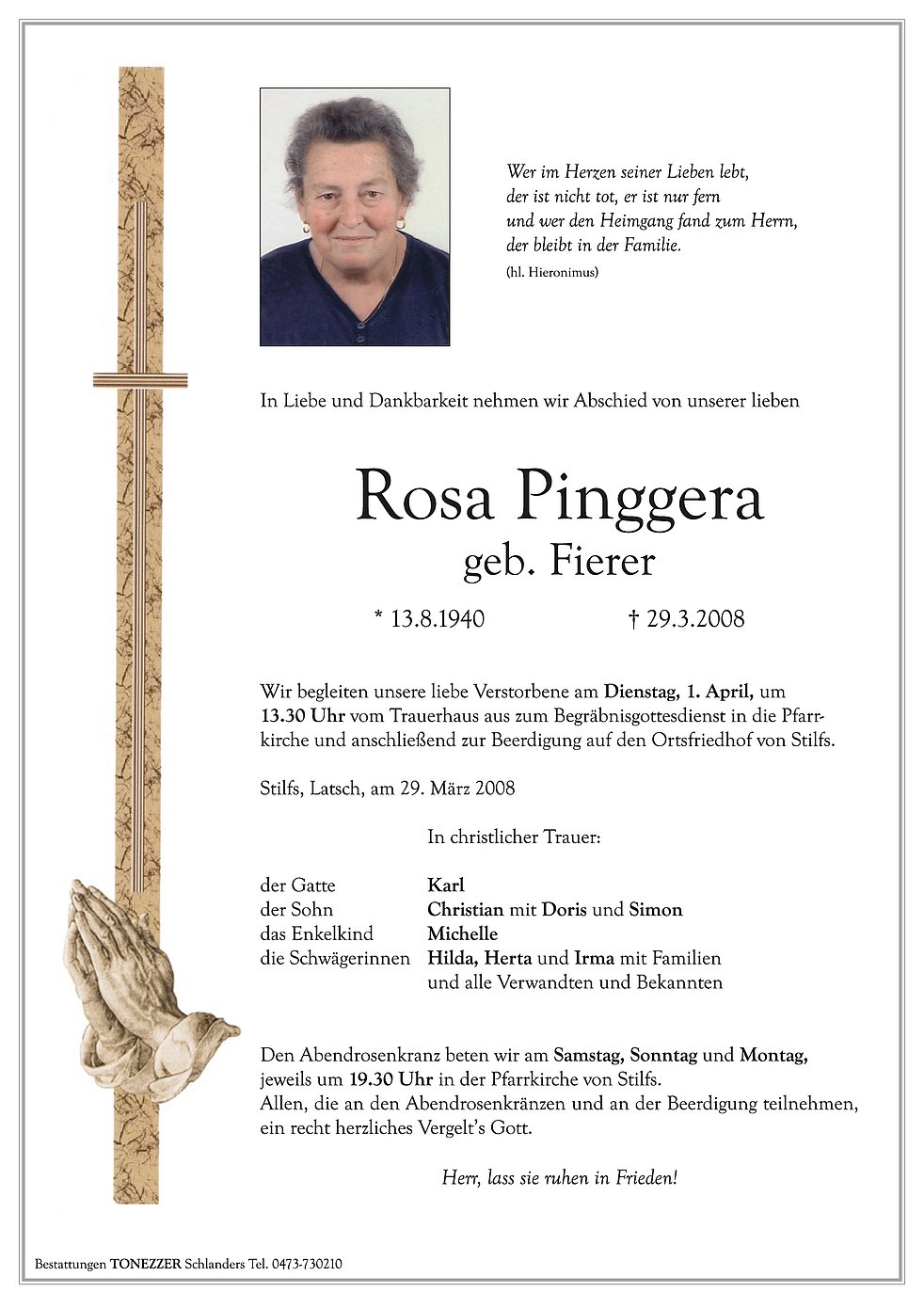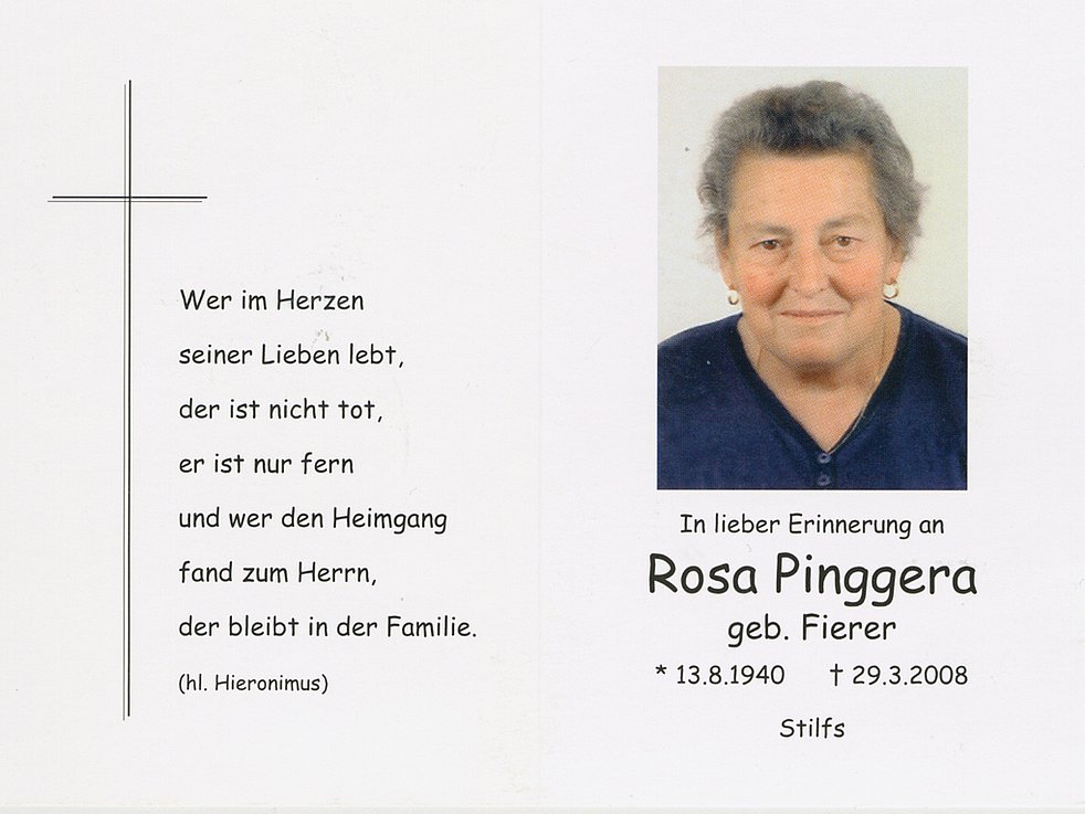 Wir begleiten unsere liebe Verstorbene am Dienstag, 1. April, um 13.30 Uhr vom Trauerhaus aus zum Begräbnisgottesdienst in die Pfarrkirche und anschließend zur Beerdigung auf den Ortsfriedhof von Stilfs.