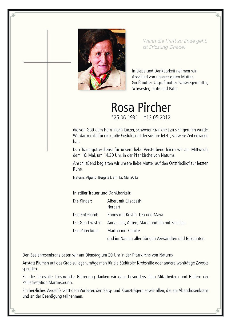 Den Trauergottesdienst für unsere liebe Verstorbene feiern wir am Mittwoch, dem 16. Mai, um 14.30 Uhr, in der Pfarrkirche von Naturns. Anschließend begleiten wir unsere liebe Mutter auf den Ortsfriedhof zur letzten Ruhe.