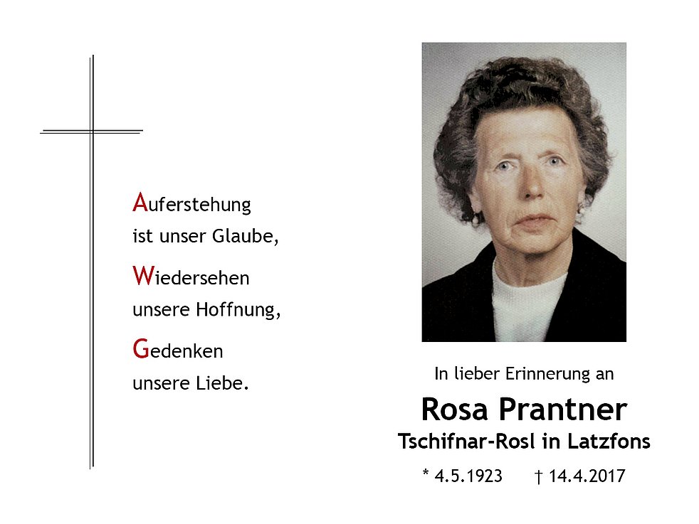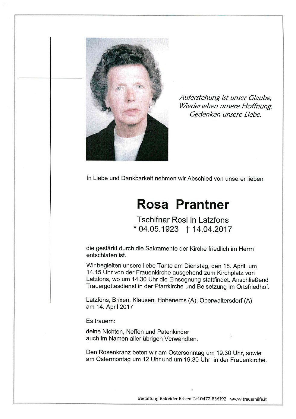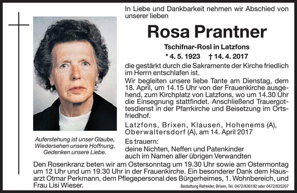 Wir begleiten unsere liebe Tante am Dienstag, den 18. April, um 14.15 Uhr von der Frauenkirche ausgehend zum Kirchplatz von Latzfons, wo um 14.30 Uhr die Einsegnung stattfindet. Anschließend Trauergottesdienst in der Pfarrkirche und Beisetzung im Ortsfriedhof.