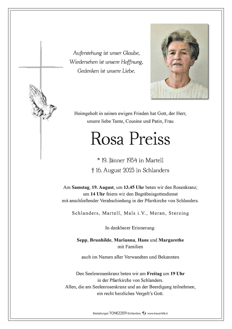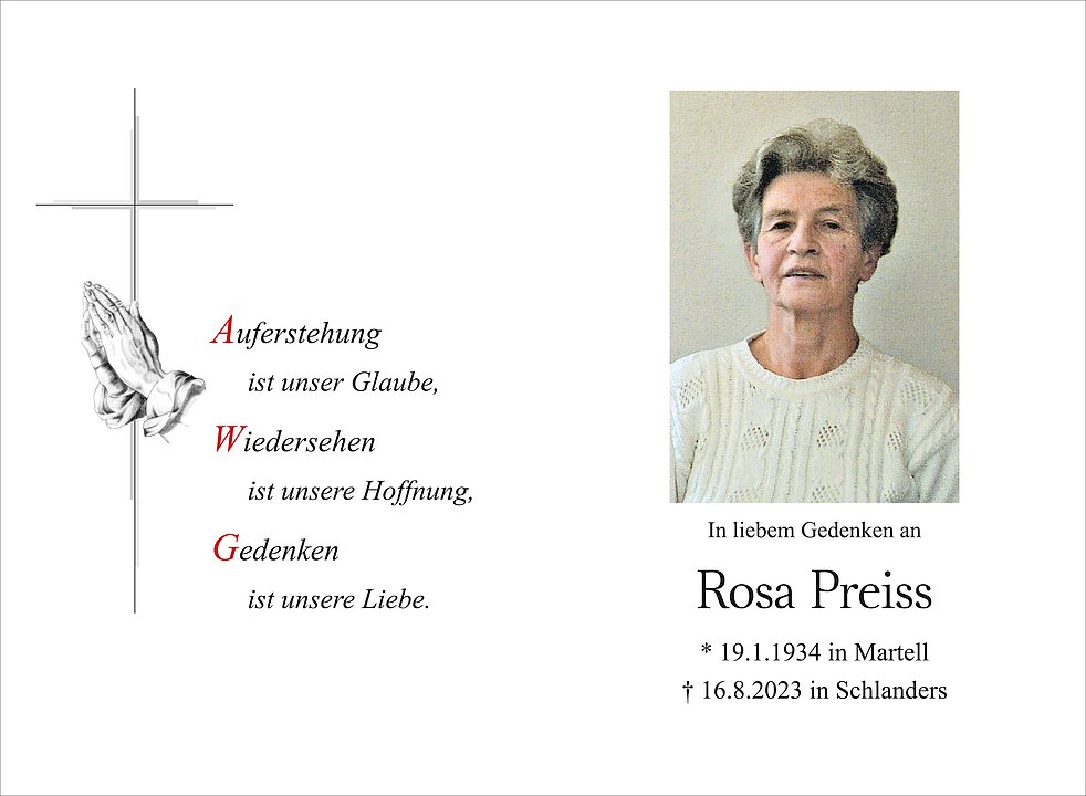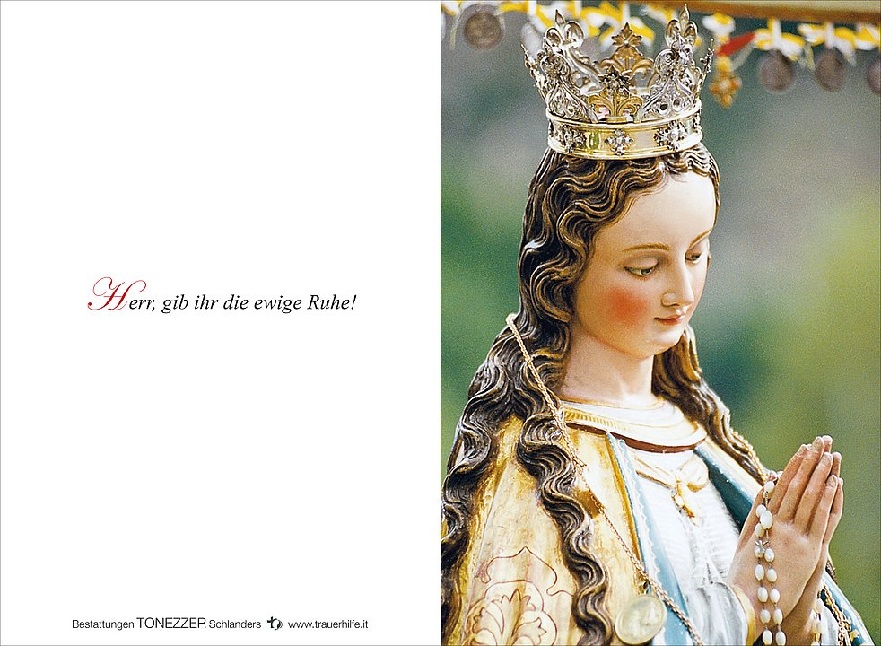Am Samstag, 19. August, um 13.45 Uhr beten wir den Rosenkranz; um 14 Uhr feiern wir den Begräbnisgottesdienst mit anschließender Verabschiedung in der Pfarrkirche von Schlanders.