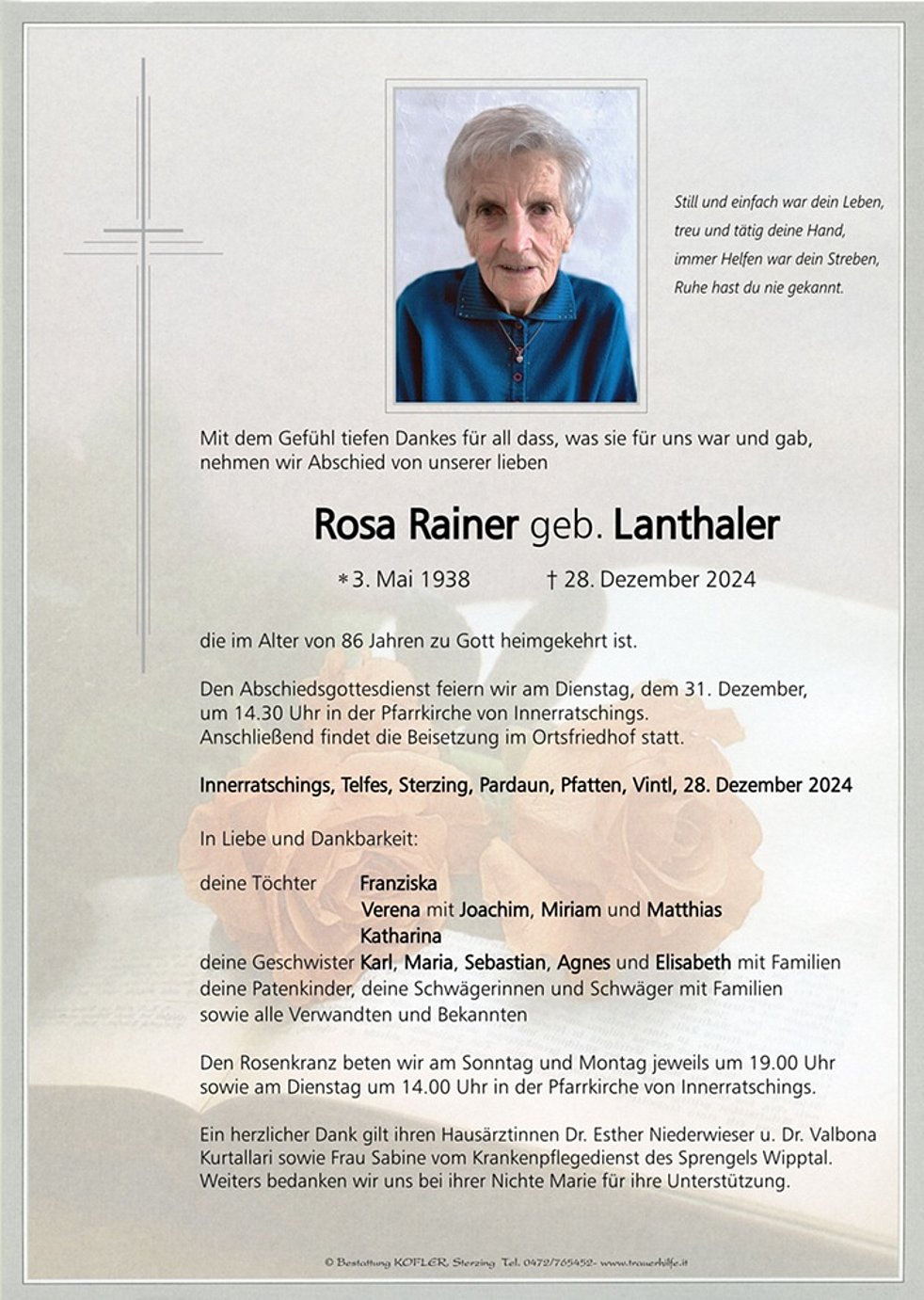 Ein herzlicher Dank gilt ihren Hausärztinnen Dr. Esther Niederwieser u. Dr. Valbona Kurtallari sowie Frau Sabine vom Krankenpflegedienst des Sprengels Wipptal. Weiters bedanken wir uns bei ihrer Nichte Marie für ihre Unterstützung.