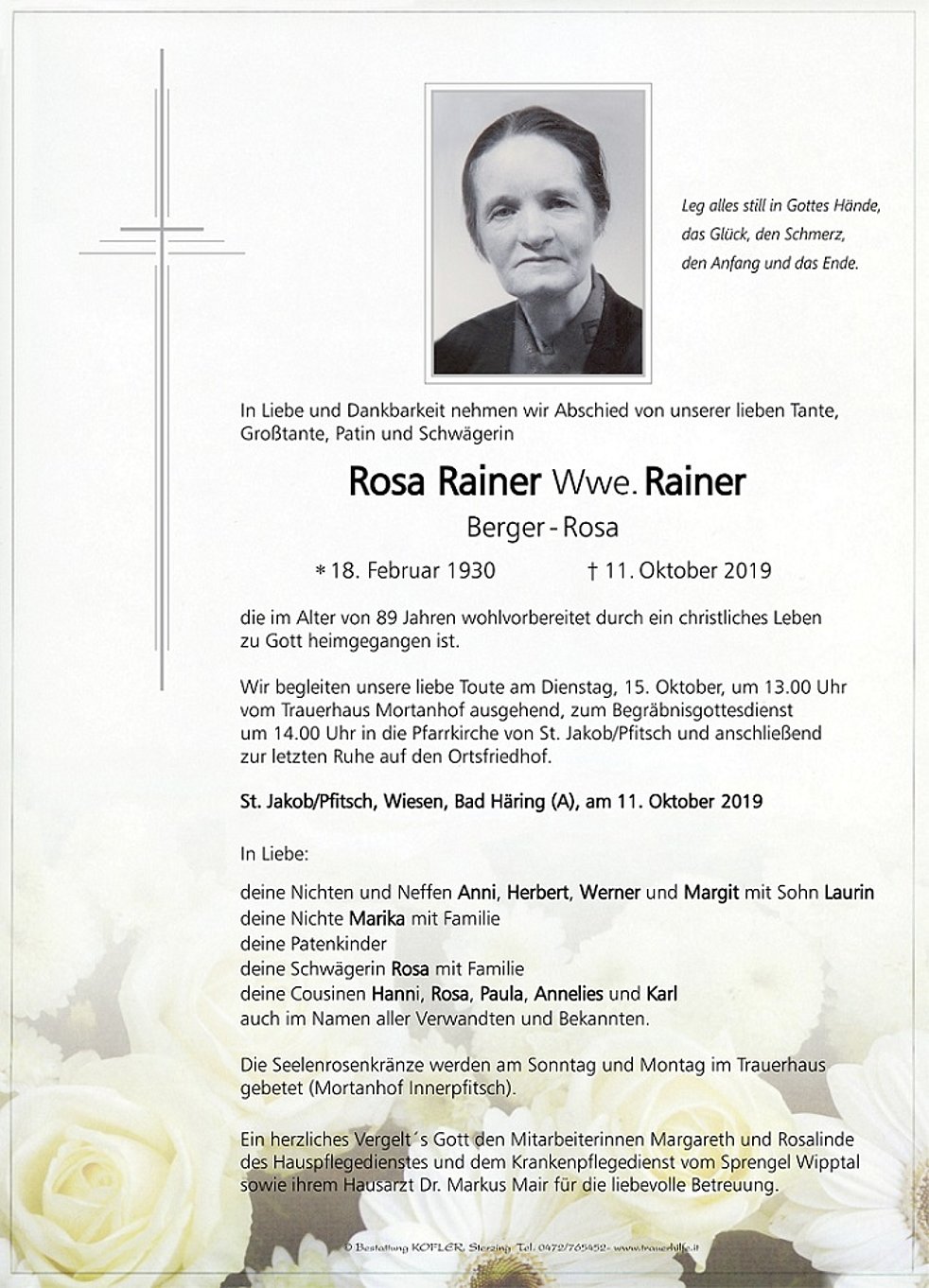Wir begleiten unsere liebe Toute am Dienstag, 15. Oktober, um 13.00 Uhr vom Trauerhaus Mortanhof ausgehend, zum Begräbnisgottesdienst um 14.00 Uhr in die Pfarrkirche von St. Jakob/Pfitsch und anschließend zur letzten Ruhe auf den Ortsfriedhof.