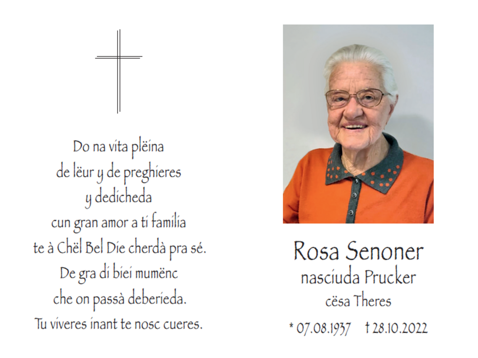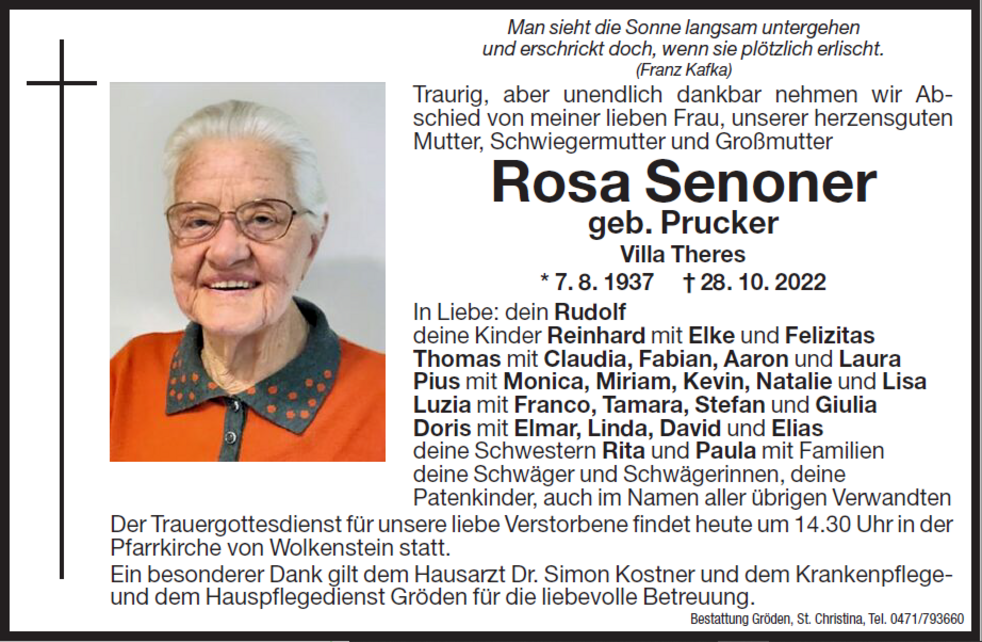 Der Trauergottesdienst für unsere liebe Verstorbene findet am Samstag, dem 29. Oktober, um 14.30 Uhr in der Pfarrkirche von Wolkenstein statt.