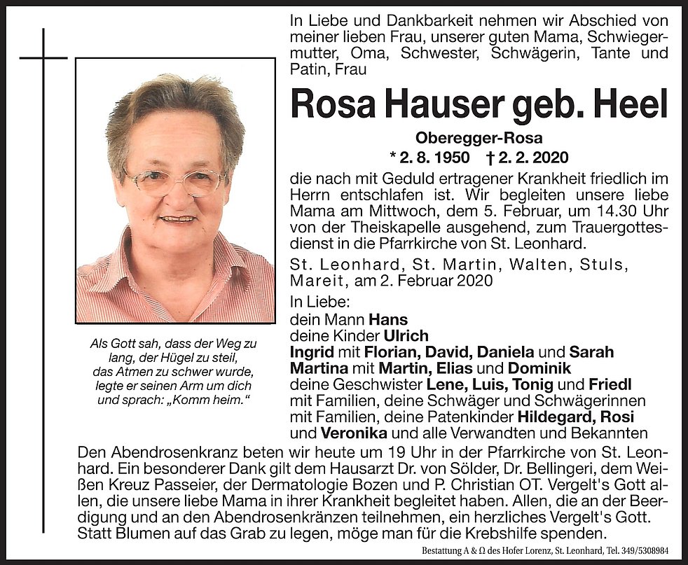 Wir begleiten unsere liebe Mama am Mittwoch, dem 5. Februar um 14.30 Uhr