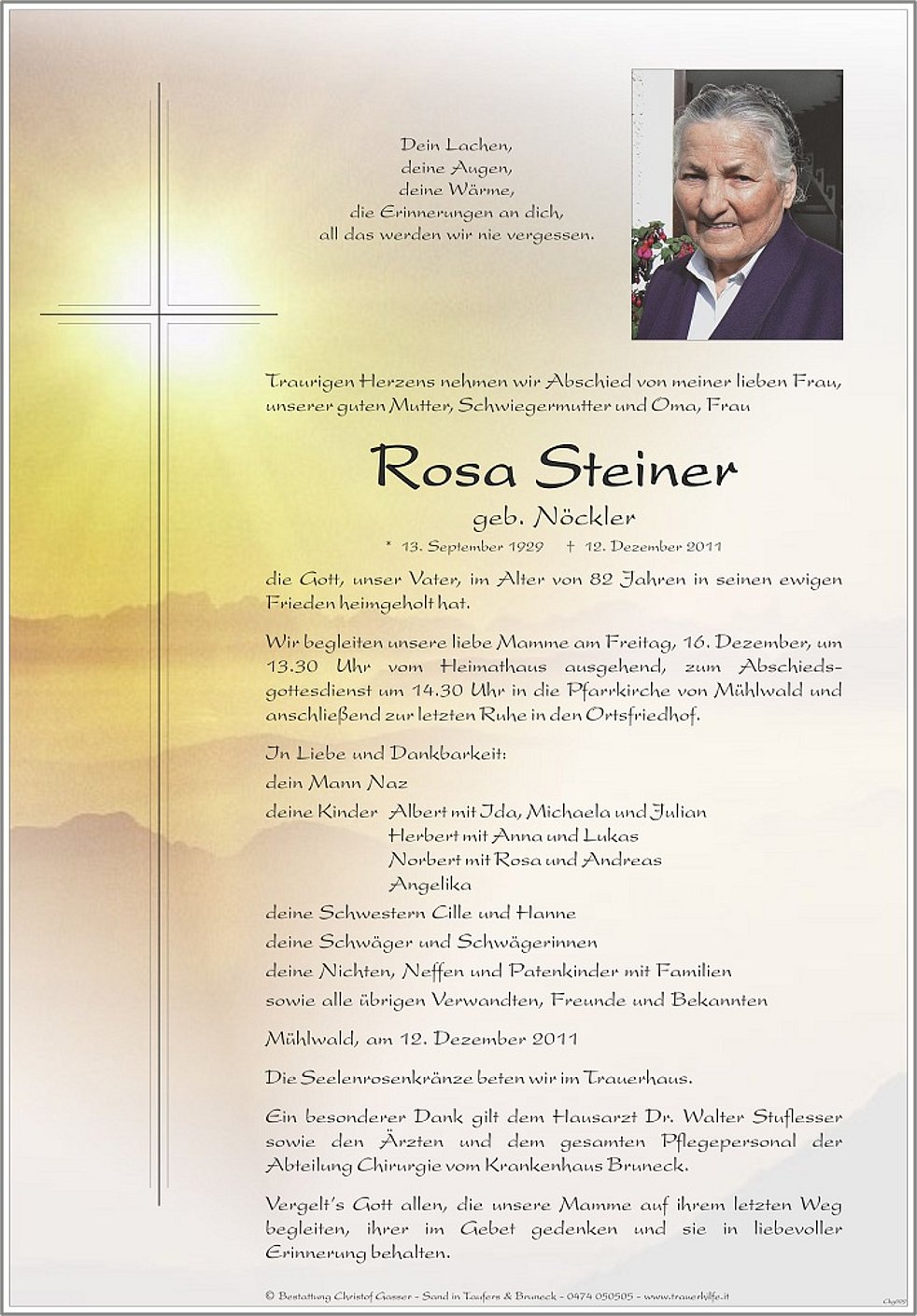 Wir begleiten unsere liebe Mamme am Freitag, 16. Dezember, um 13.30 Uhr vom Heimathaus ausgehend, zum Abschieds-gottesdienst um 14.30 Uhr in die Pfarrkirche von Mühlwald und anschließend zur letzten Ruhe in den Ortsfriedhof.