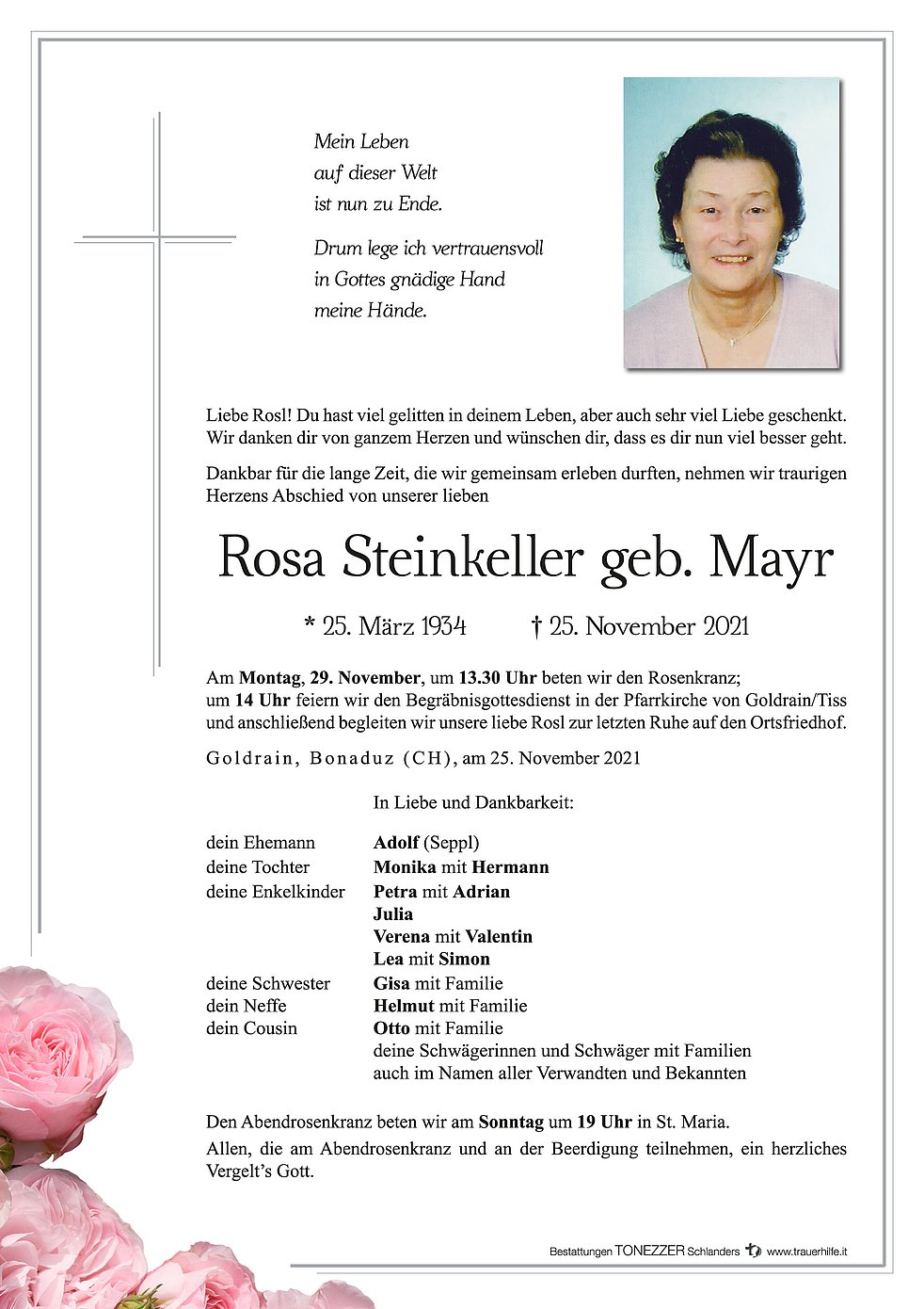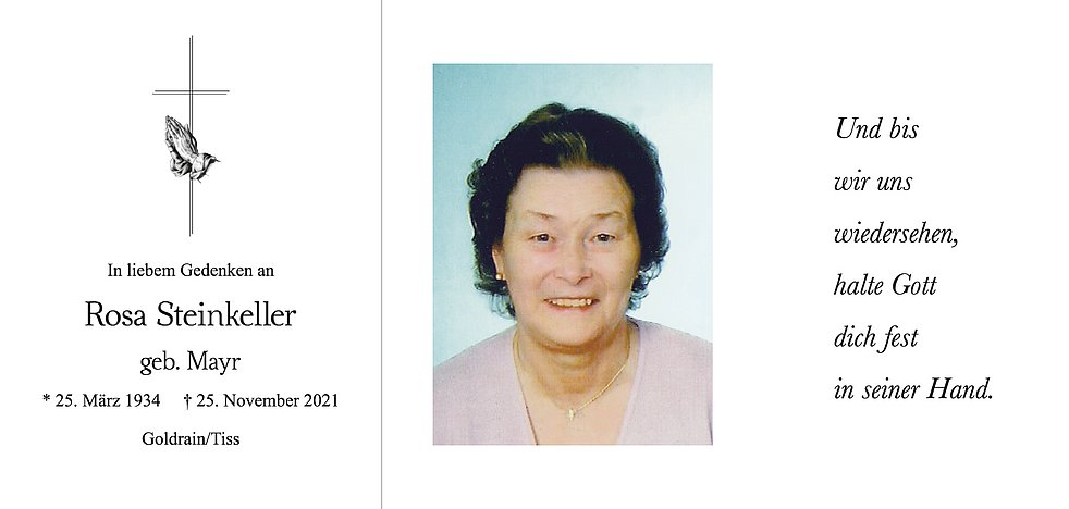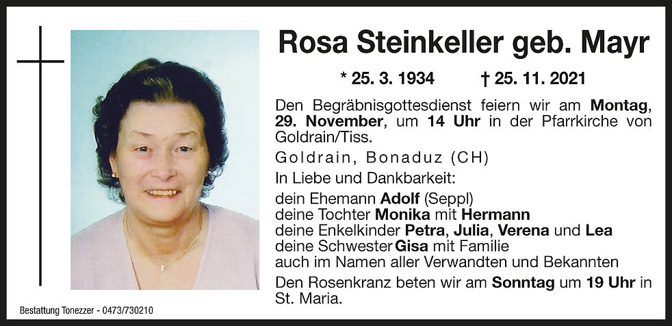 Am Montag, 29. November, um 13.30 Uhr beten wir den Rosenkranz; um 14 Uhr feiern wir den Begräbnisgottesdienst in der Pfarrkirche von Goldrain/Tiss und anschließend begleiten wir unsere liebe Rosl zur letzten Ruhe auf den Ortsfriedhof.