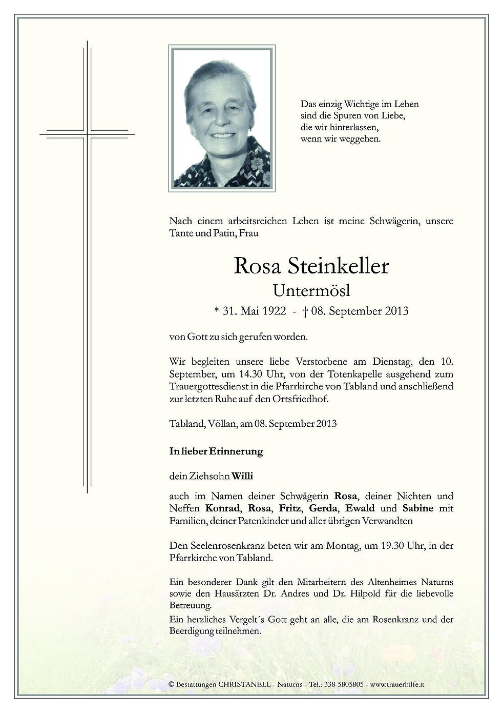 Wir begleiten unsere liebe Verstorbene am Dienstag, den 10. September, um 14.30 Uhr, von der Totenkapelle ausgehend zum Trauergottesdienst in die Pfarrkirche von Tabland und anschließend zur letzten Ruhe auf den Ortsfriedhof.