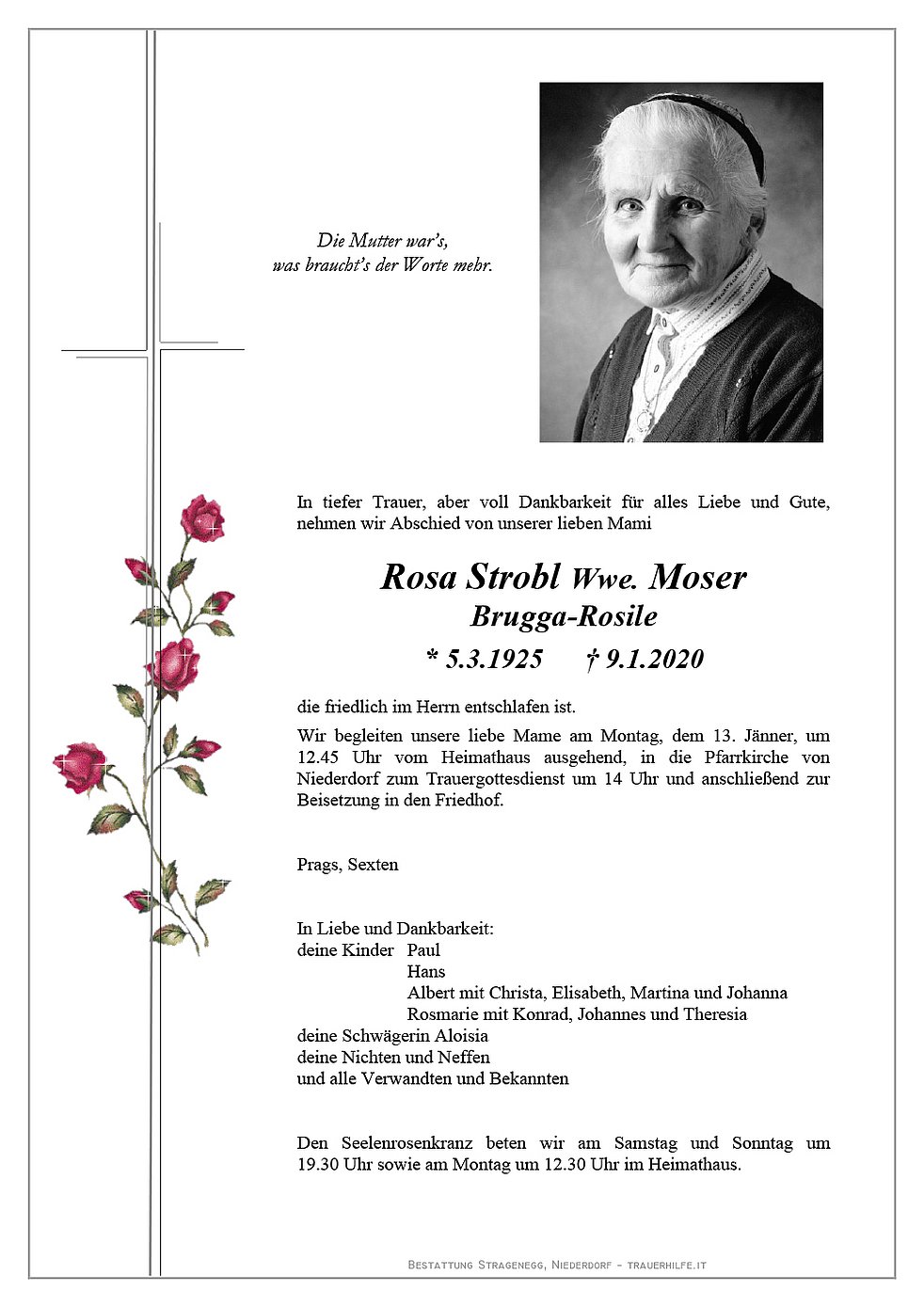 Wir begleiten unsere liebe Mame am Montag, dem 13. Jänner, um 12.45 Uhr vom Heimathaus ausgehend, in die Pfarrkirche von Niederdorf zum Trauergottesdienst um 14 Uhr und anschließend zur Beisetzung in den Friedhof.