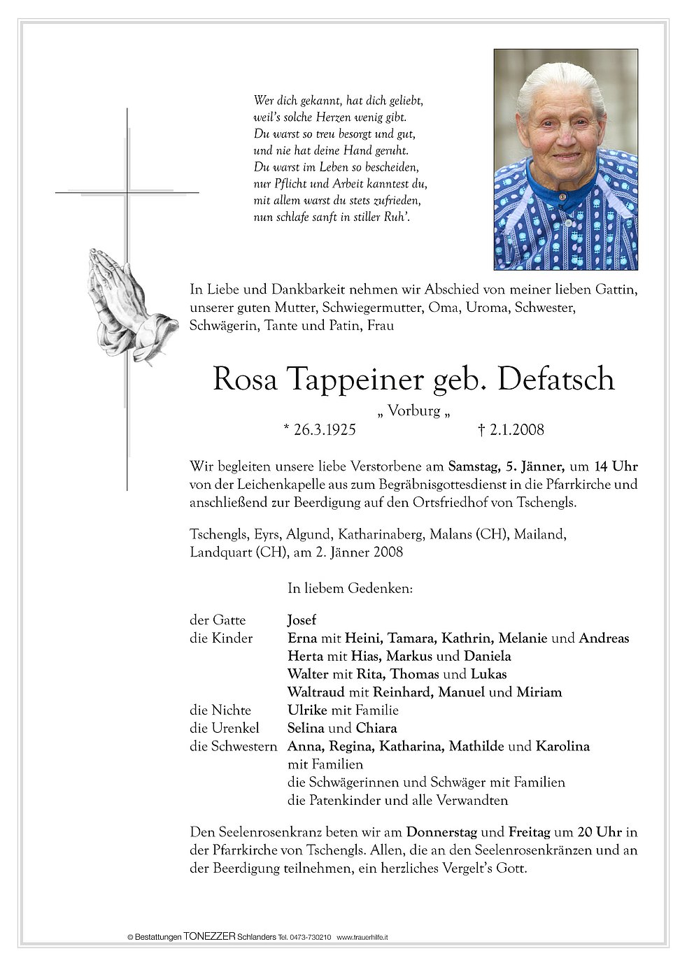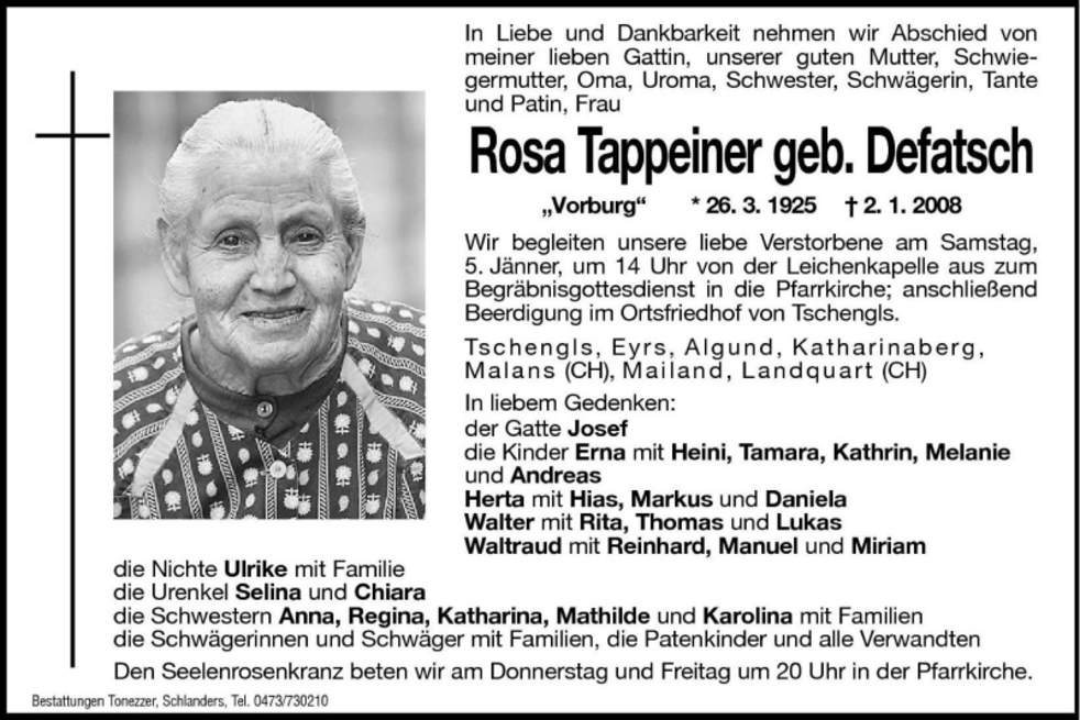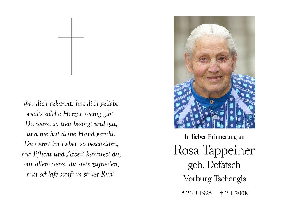 Wir begleiten unsere liebe Verstorbene am Samstag, 5. Jänner, um 14 Uhr von der Leichenkapelle aus zum Begräbnisgottesdienst in die Pfarrkirche und anschließend zur Beerdigung auf den Ortsfriedhof von Tschengls.
