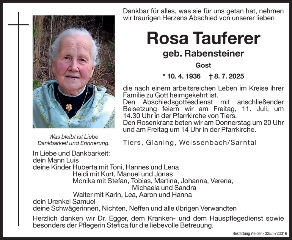 Den Abschiedsgottesdienst mit anschließender Beisetzung feiern wir am Freitag, 11. Juli, um 14.30 Uhr in der Pfarrkirche von Tiers.