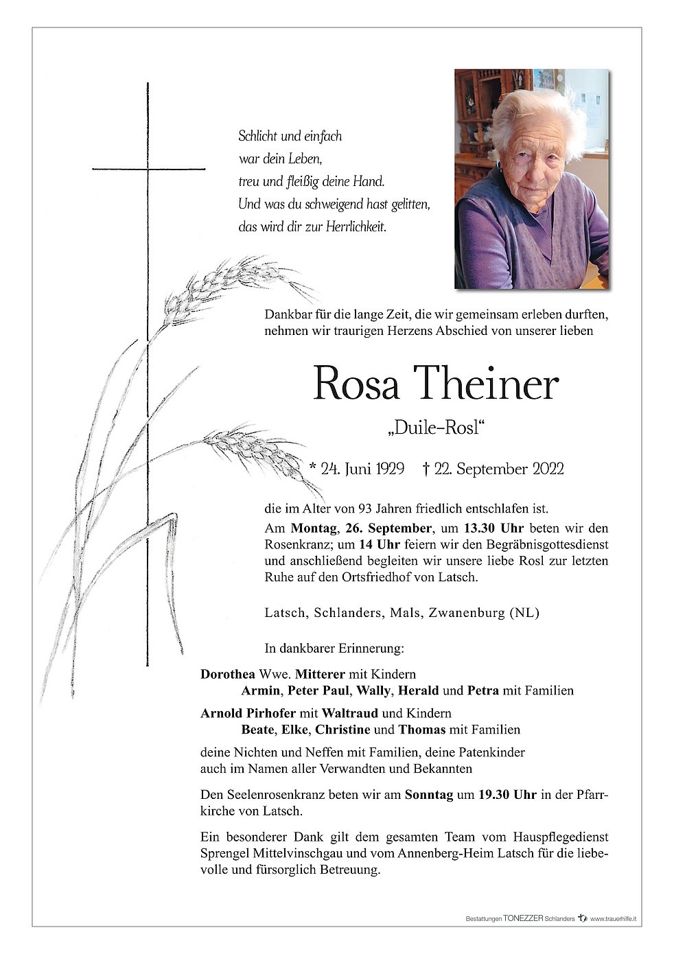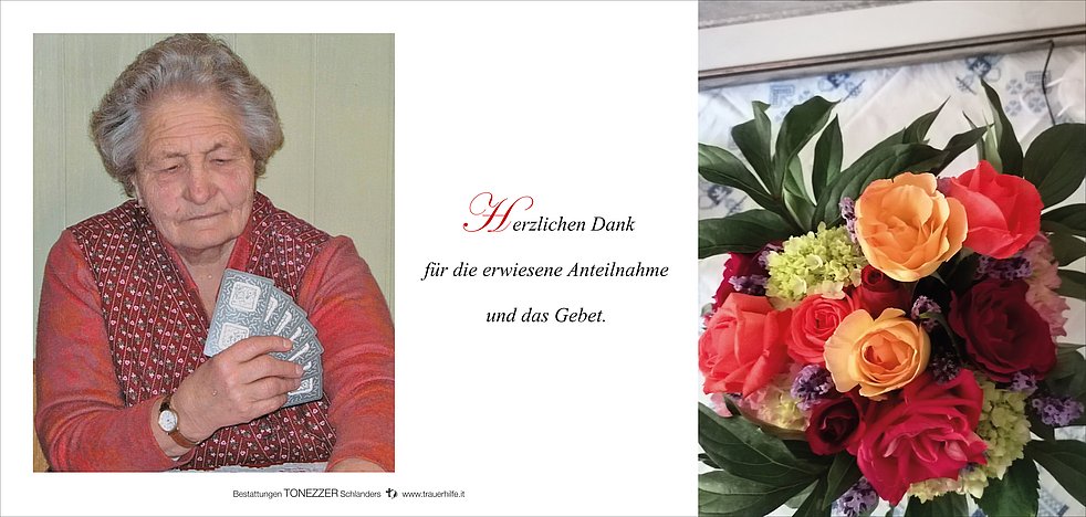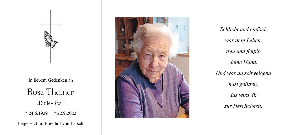 Am Montag, 26. September, um 13.30 Uhr beten wir den Rosenkranz; um 14 Uhr feiern wir den Begräbnisgottesdienst und anschließend begleiten wir unsere liebe Rosl zur letzten Ruhe auf den Ortsfriedhof von Latsch.