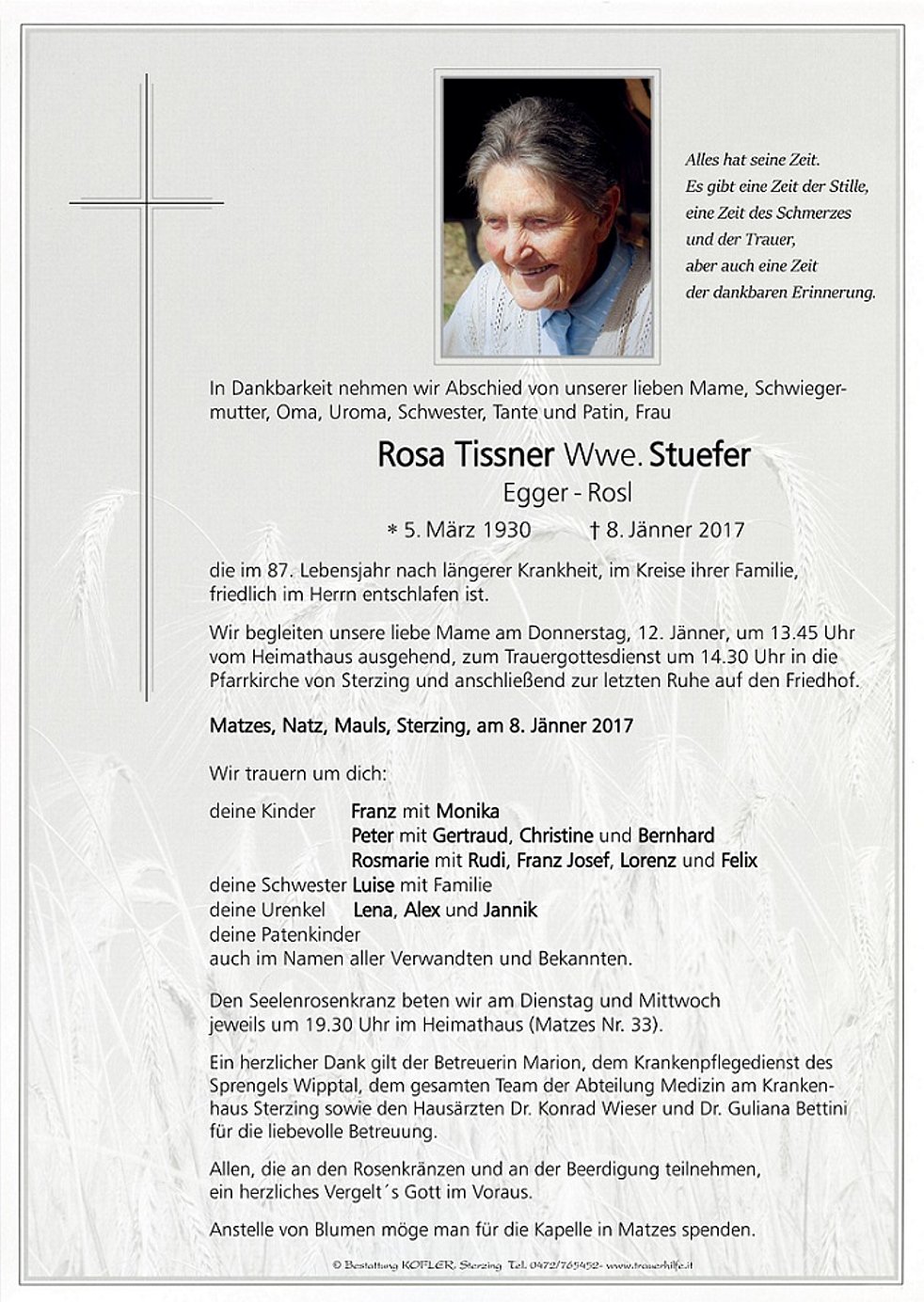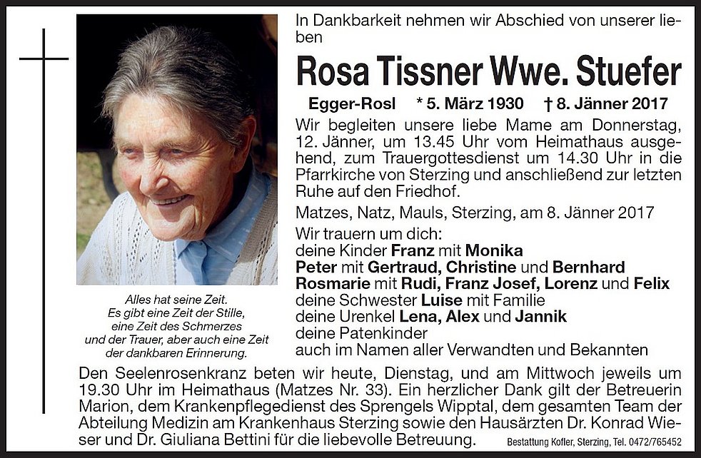 Wir begleiten unsere liebe Mame am Donnerstag, 12. Jänner, um 13.45 Uhr vom Heimathaus ausgehend, zum Trauergottesdienst um 14.30 Uhr in die Pfarrkirche von Sterzing und anschließend zur letzten Ruhe auf den Friedhof.