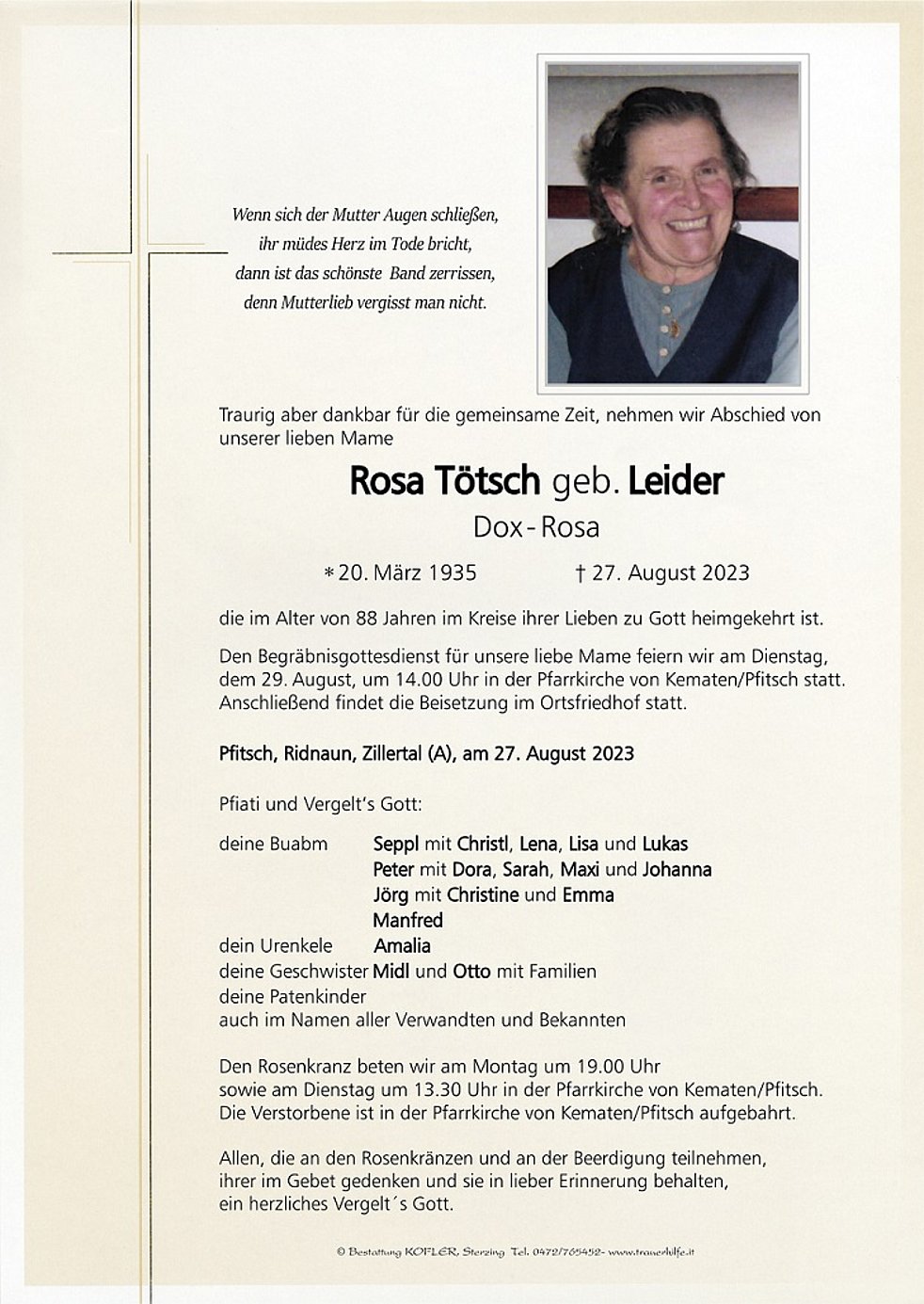 die im Alter von 88 Jahren im Kreise ihrer Lieben zu Gott heimgekehrt ist. Den Begräbnisgottesdienst für unsere liebe Mame feiern wir am Dienstag, dem 29. August, um 14.00 Uhr in der Pfarrkirche von Kematen/Pfitsch statt. Anschließend findet die Beisetzung im Ortsfriedhof statt.
