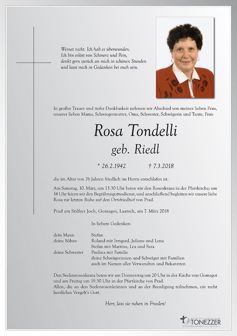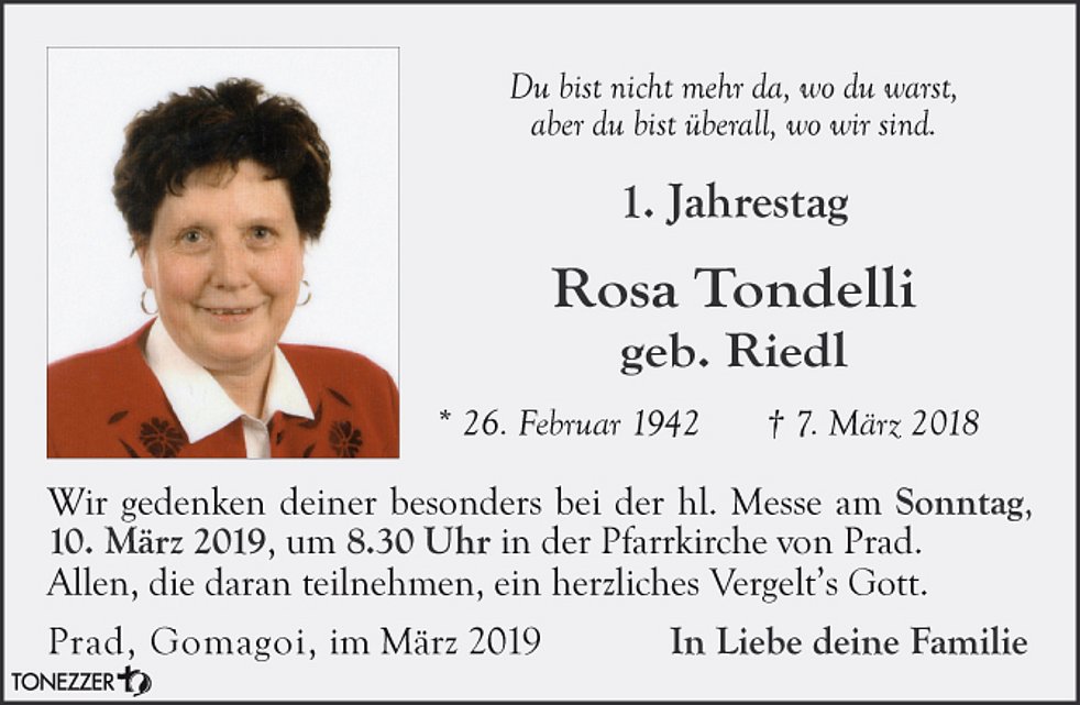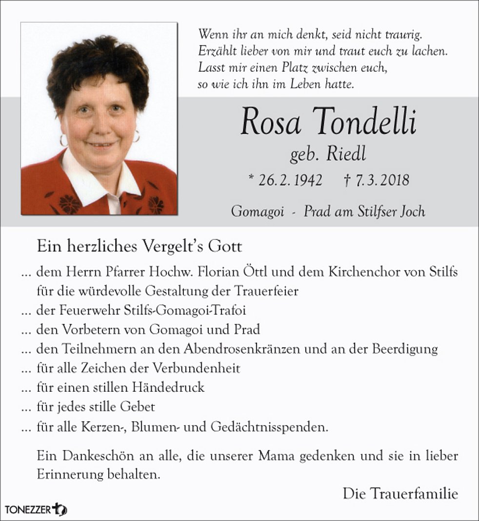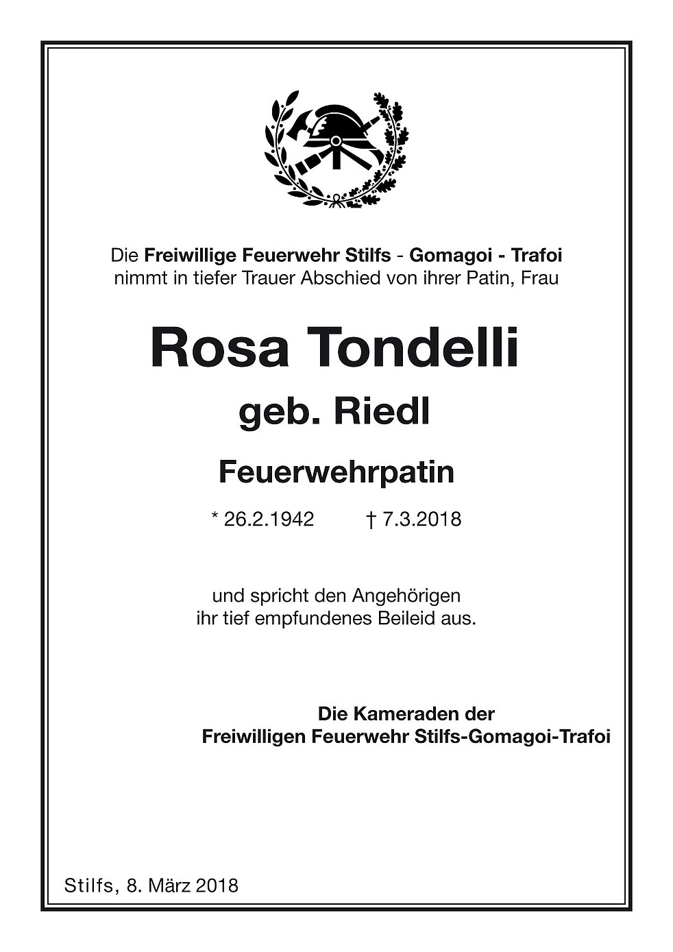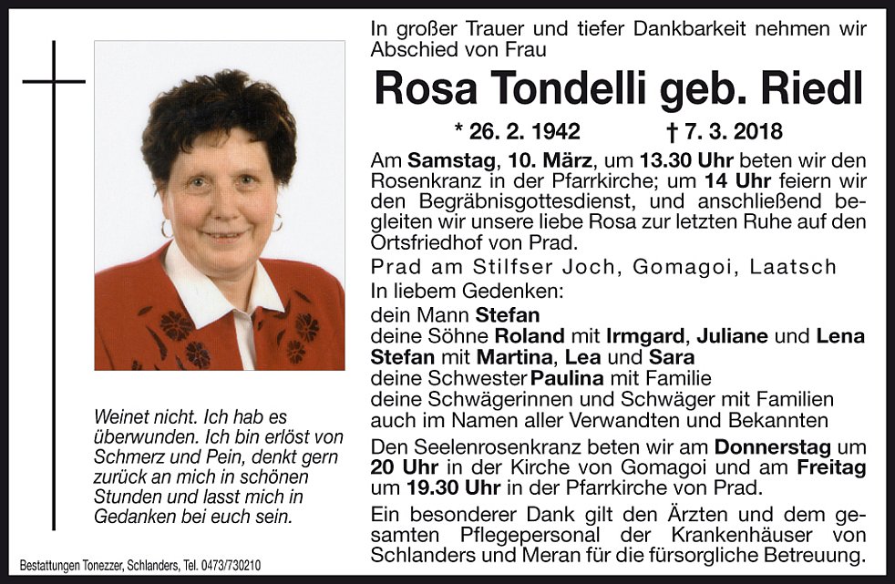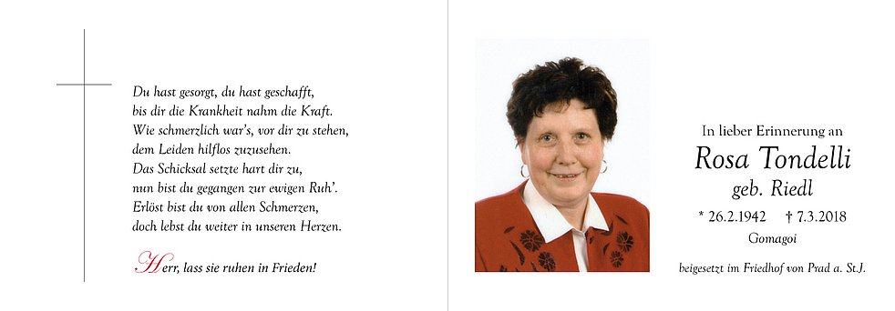 Am Samstag, 10. März, um 13.30 Uhr beten wir den Rosenkranz in der Pfarrkirche; um 14 Uhr feiern wir den Begräbnisgottesdienst, und anschließend begleiten wir unsere liebe Rosa zur letzten Ruhe auf den Ortsfriedhof von Prad.