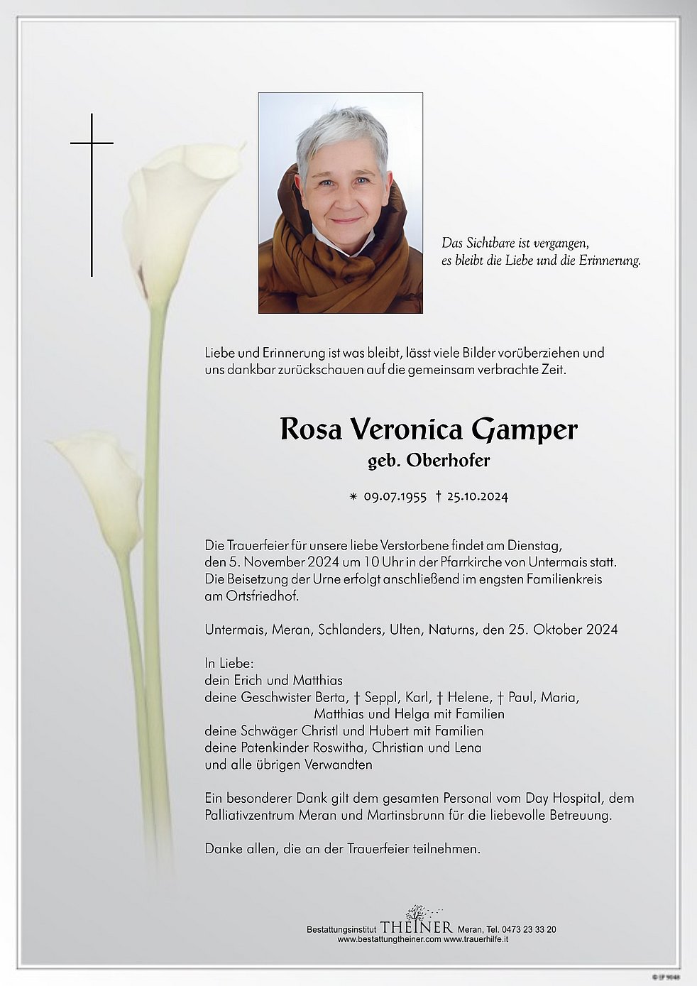 Die Trauerfeier für unsere liebe Verstorbene findet am Dienstag, den 5. November 2024 um 10 Uhr in der Pfarrkirche von Untermais statt.