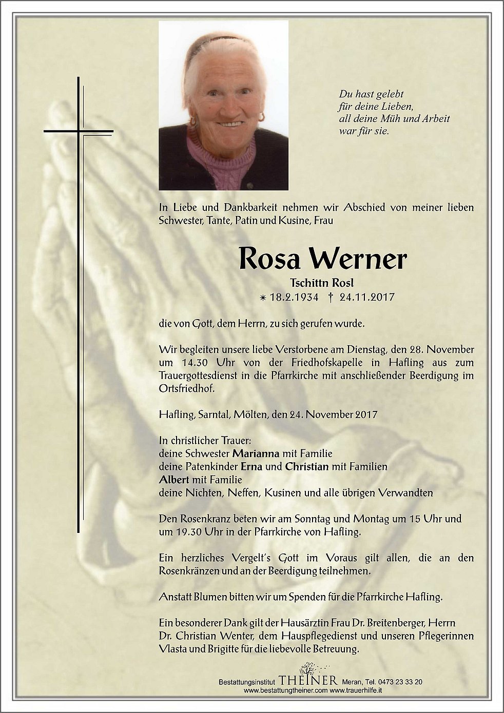 Wir begleiten unsere liebe Verstorbene am Dienstag, den 28. November um 14.30 Uhr von der Friedhofskapelle in Hafling aus zum Trauergottesdienst in die Pfarrkirche mit anschließender Beerdigung im Ortsfriedhof.