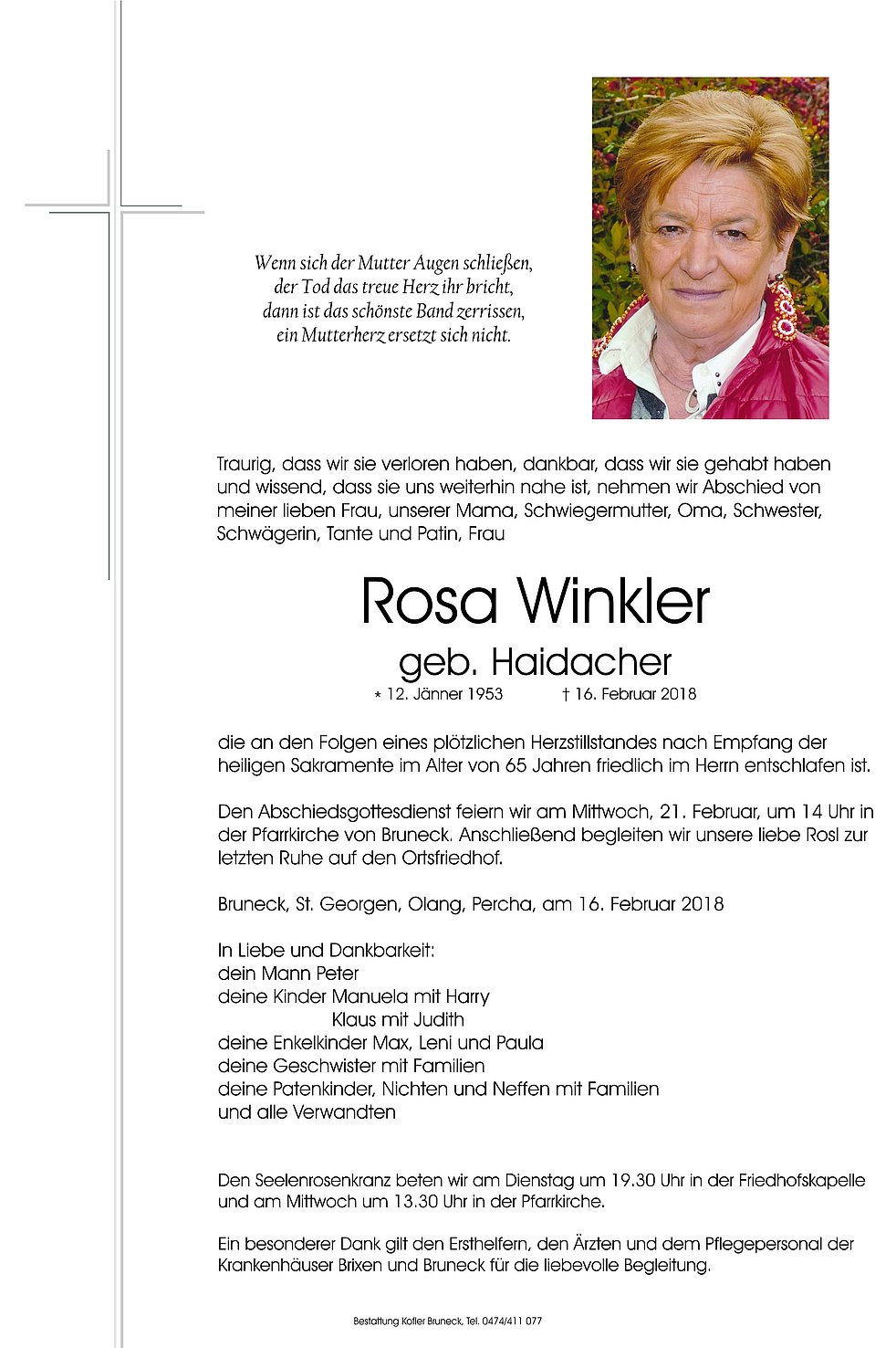 Den Abschiedsgottesdienst feiern wir am Mittwoch, 21. Februar, um 14 Uhr in der Pfarrkirche von Bruneck. Anschließend begleiten wir unsere liebe Rosl zur letzten Ruhe auf den Ortsfriedhof.