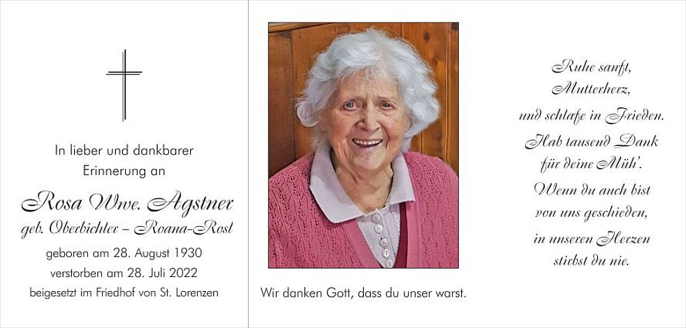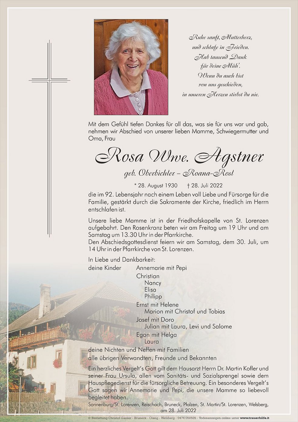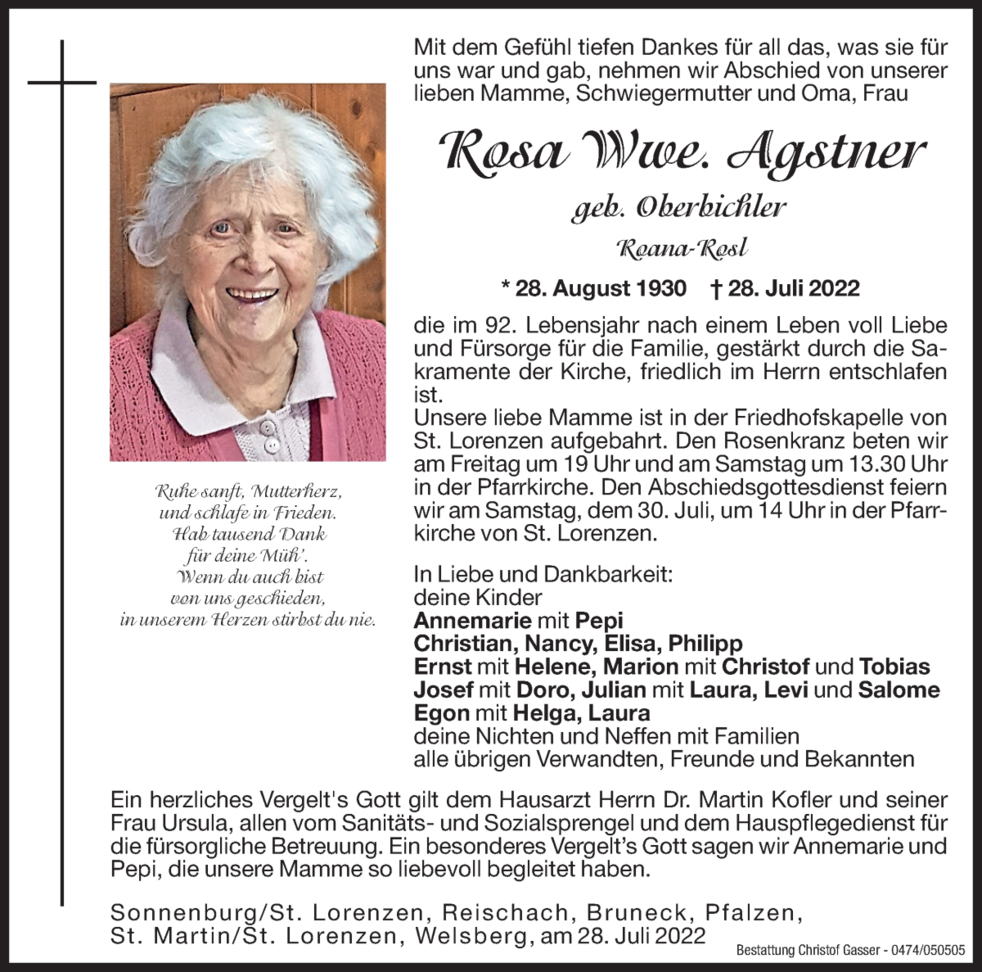 Unsere liebe Mamme ist in der Friedhofskapelle von St. Lorenzen aufgebahrt. Den Rosenkranz beten wir am Freitag um 19 Uhr und am Samstag um 13.30 Uhr in der Pfarrkirche.