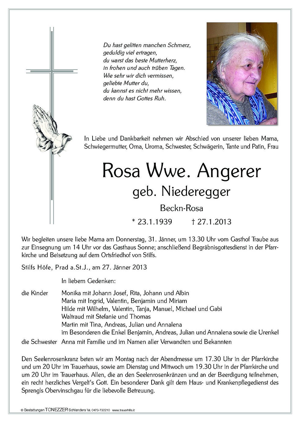 Wir begleiten unsere liebe Mama am Donnerstag, 31. Jänner, um 13.30 Uhr vom Gasthof Traube aus zur Einsegnung um 14 Uhr vor das Gasthaus Sonne; anschließend Begräbnisgottesdienst in der Pfarrkirche und Beisetzung auf dem Ortsfriedhof von Stilfs.
