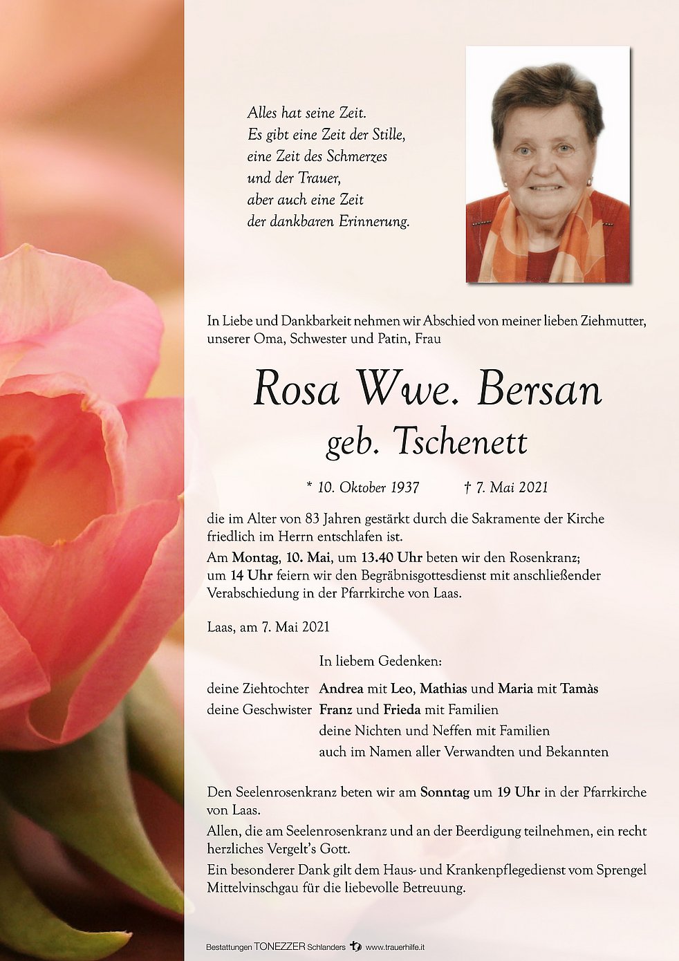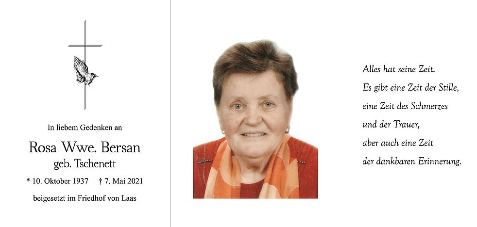 Am Montag, 10. Mai, um 13.40 Uhr beten wir den Rosenkranz; um 14 Uhr feiern wir den Begräbnisgottesdienst mit anschließender Verabschiedung in der Pfarrkirche von Laas.