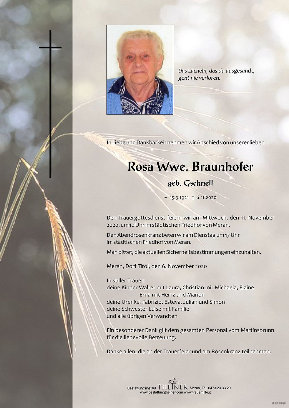 Den Trauergottesdienst feiern wir am Mittwoch, den 11. November 2020, um 10 Uhr im städtischen Friedhof von Meran.