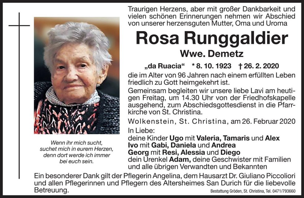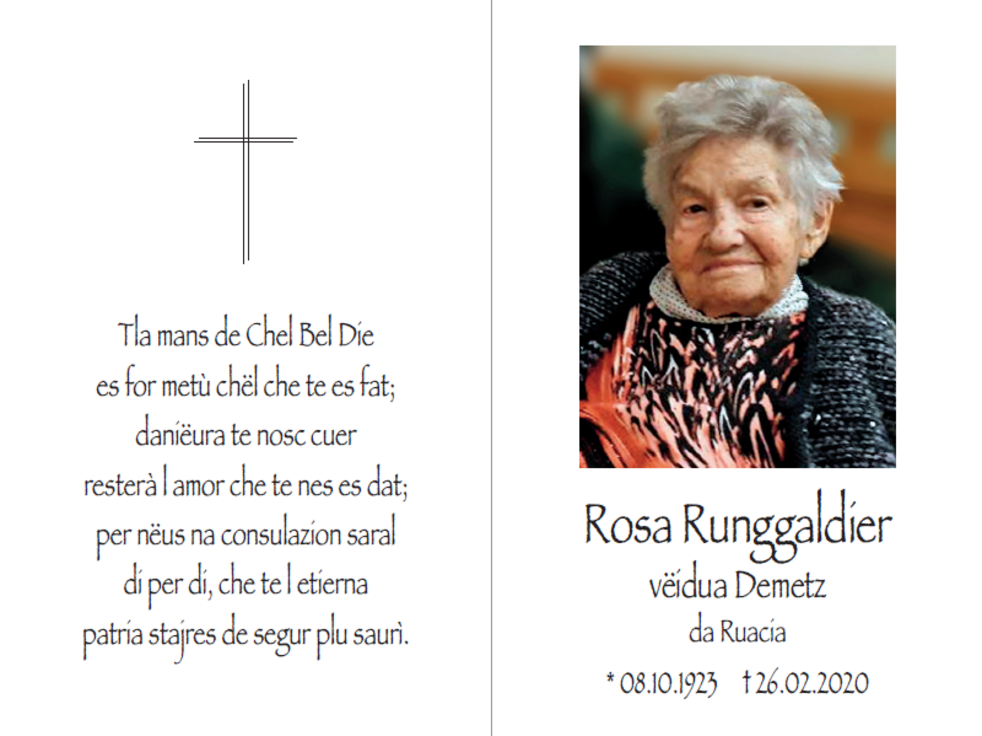 Ein besonderer Dank gilt der Pflegerin Angelina, Hausarzt Dr. Giuliano Piccoliori und allen Pflegerinnen und Pflegern des Altersheimes San Durich für die liebevolle Betreuung.