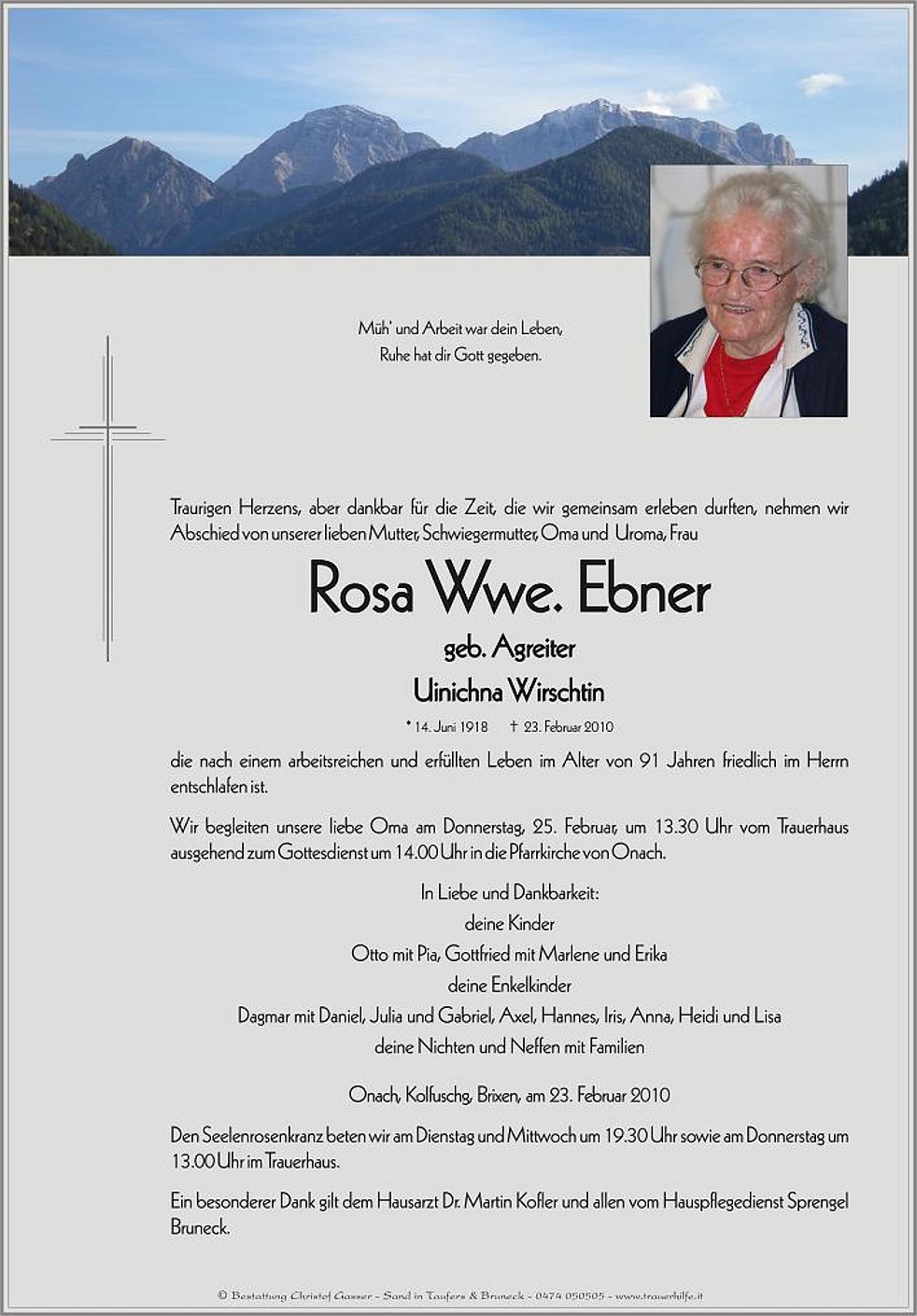 Wir begleiten unsere liebe Oma am Donnerstag, 25. Februar, um 13.30 Uhr vom Trauerhaus ausgehend zum Gottesdienst um 14.00 Uhr in die Pfarrkirche von Onach.