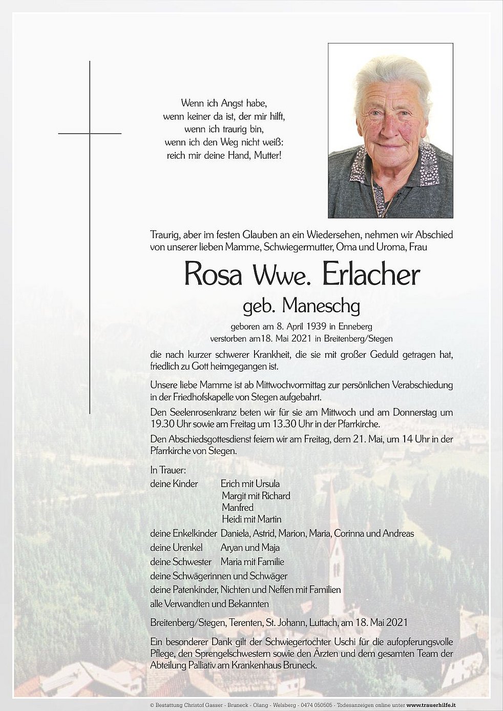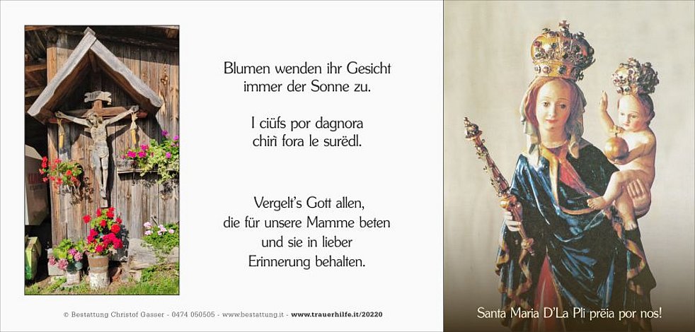 Ein besonderer Dank gilt der Schwiegertochter Uschi für die aufopferungsvolle Pflege, den Sprengelschwestern sowie den Ärzten und dem gesamten Team der Abteilung Palliativ am Krankenhaus Bruneck.