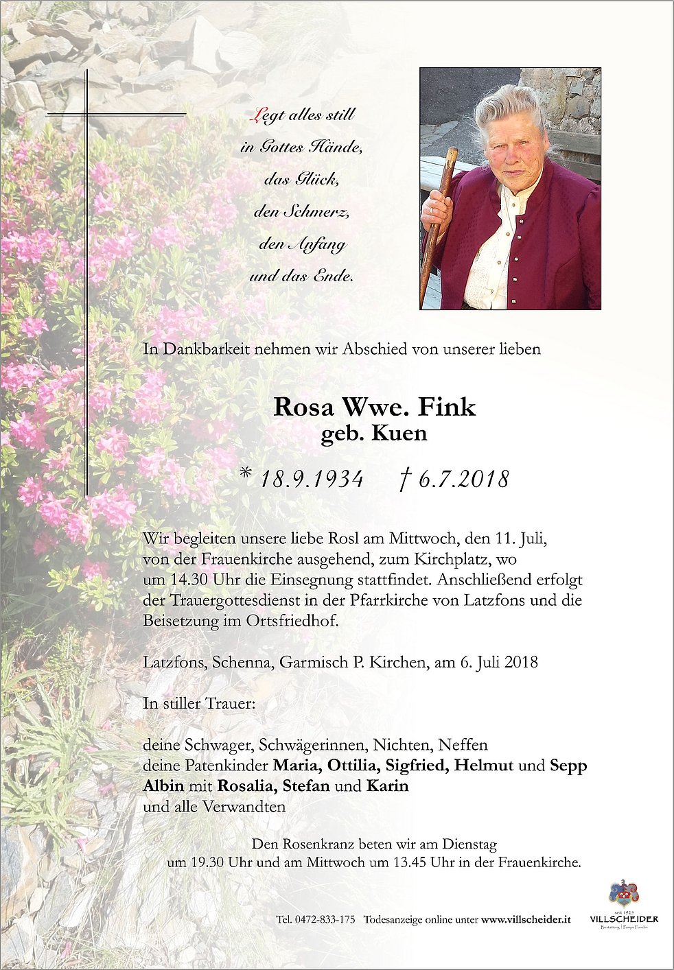 um 14.30 Uhr die Einsegnung stattfindet. Anschließend erfolgt der Trauergottesdienst in der Pfarrkirche von Latzfons und die Beisetzung im Ortsfriedhof.