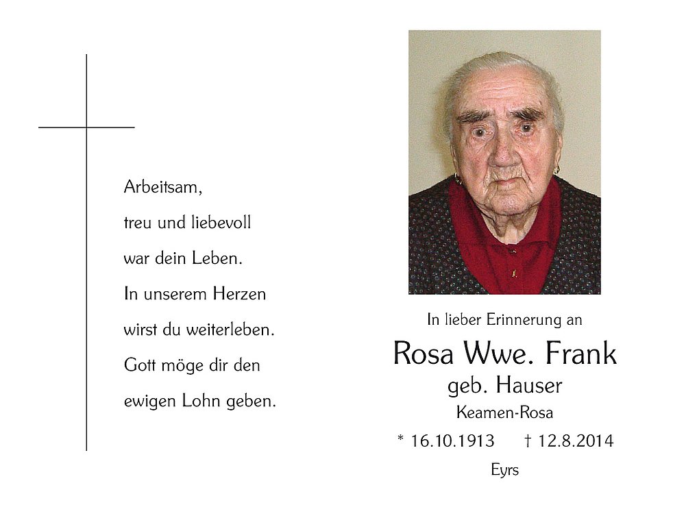Wir begleiten unsere liebe Mutter am Donnerstag, 14. August, um 15.30 Uhr von der Leichenkapelle aus zum Begräbnisgottesdienst in die Pfarrkirche und anschließend zur letzten Ruhe auf den Ortsfriedhof von Eyrs.