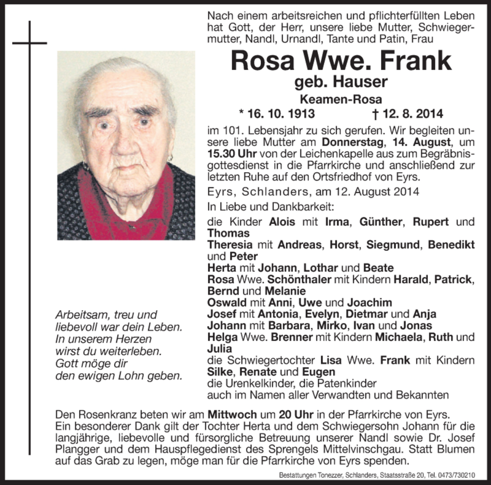 Ein besonderer Dank gilt der Tochter Herta und dem Schwiegersohn Johann für die langjährige, liebevolle und fürsorgliche Betreuung unserer Nandl sowie Dr. Josef Plangger und dem Hauspflegedienst des Sprengels Mittelvinschgau.
