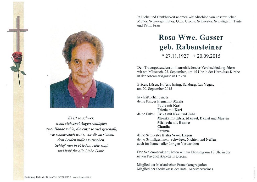 Gedankt sei den Ärzten Dr. Engl und Dr. Niederstätter, sowie dem Pflegepersonal des Bürgerheimes, 3. Wohnbereich und dem des Hartmannsheimes für die liebevolle Betreuung und allen die am Rosenkranz und an der Verabschiedung teilnehmen.