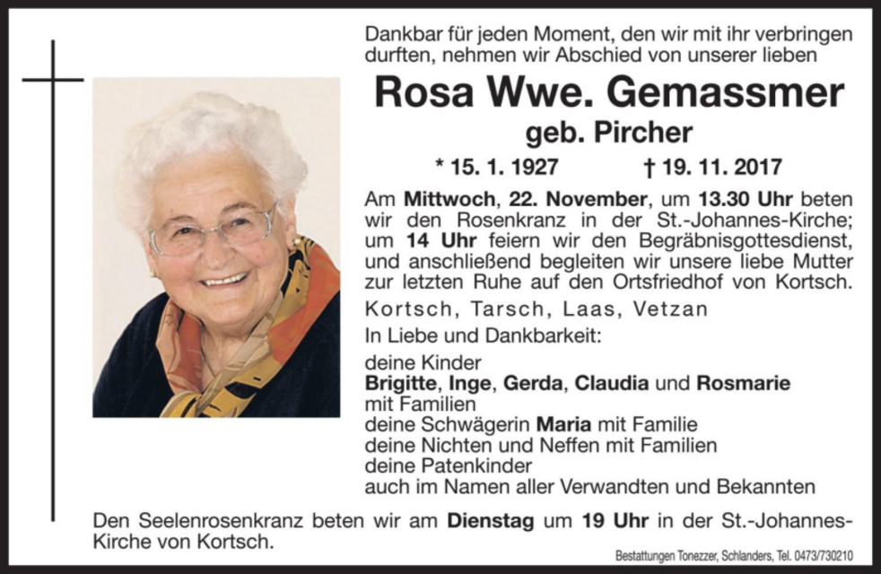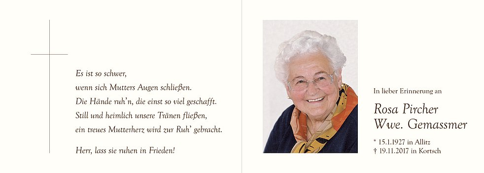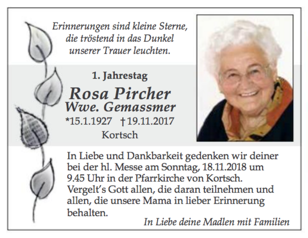 Am Mittwoch, 22. November, um 13.30 Uhr beten wir den Rosenkranz in der St.-Johannes-Kirche; um 14 Uhr feiern wir den Begräbnisgottesdienst, und anschließend begleiten wir unsere liebe Mutter zur letzten Ruhe auf den Ortsfriedhof von Kortsch.