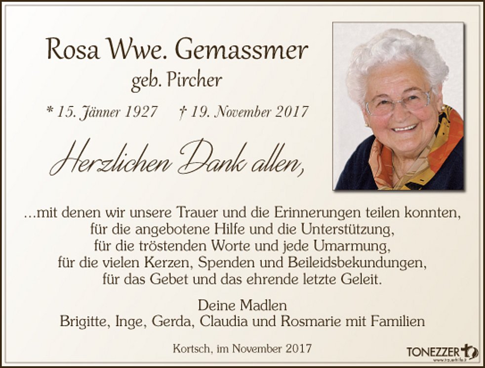 die nach einem arbeitsreichen und pflichterfüllten Leben im Alter von 90 Jahren im Kreise ihrer Familie friedlich entschlafen ist.
