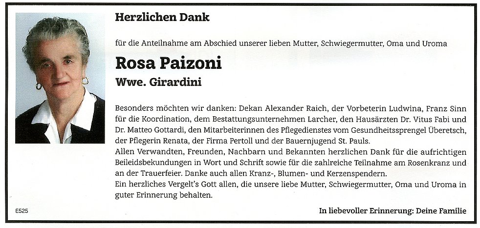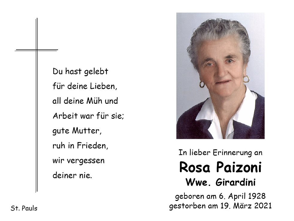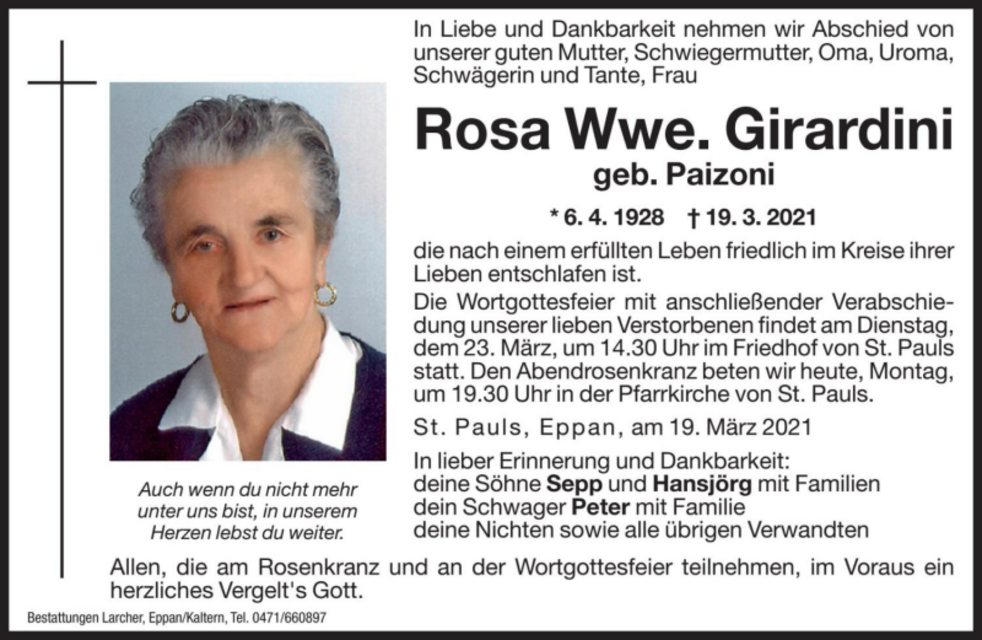 Die Wortgottesfeier mit anschließender Verabschiedung unserer lieben Verstorbenen findet am Dienstag dem 23. März um 14.30 Uhr im Friedhof von St. Pauls statt.