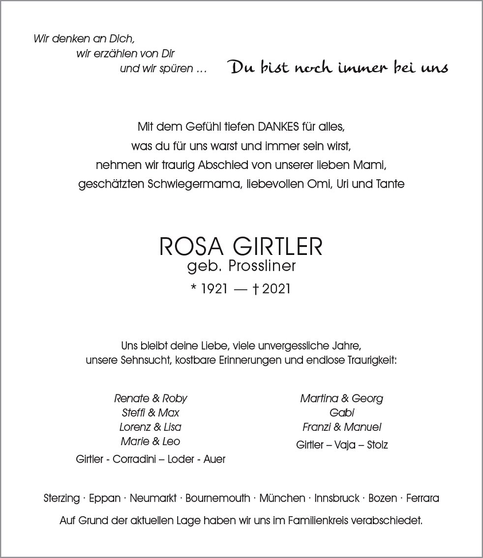 Liebe Renate, liebe Martina, wir trauern mit Euch und Euren Lieben um Eure gute Mutti Rosa und drücken Euch unser herzlichstes Beileid aus. Thomas + Margareth mit Kinder