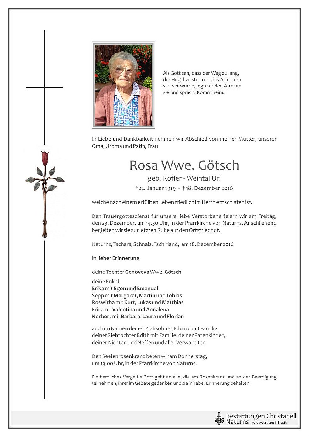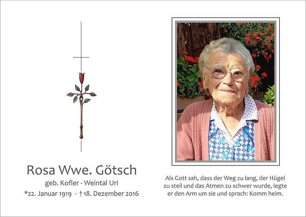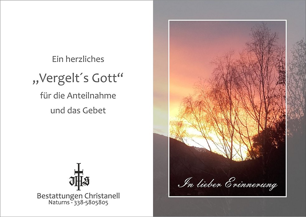 Den Trauergottesdienst für unsere liebe Verstorbene feiern wir am Freitag, den 23. Dezember, um 14.30 Uhr, in der Pfarrkirche von Naturns. Anschließend begleiten wir sie zur letzten Ruhe auf den Ortsfriedhof.