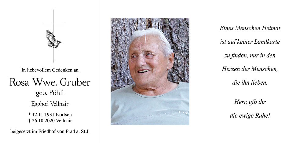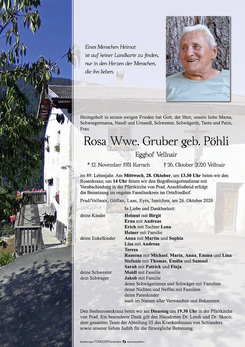 im 89. Lebenjahr. Am Mittwoch, 28. Oktober, um 13.30 Uhr beten wir den Rosenkranz; um 14 Uhr feiern wir den Begräbnisgottesdienst mit Verabschiedung in der Pfarrkirche von Prad. Anschließend erfolgt die Beisetzung im engsten Familienkreis im Ortsfriedhof.